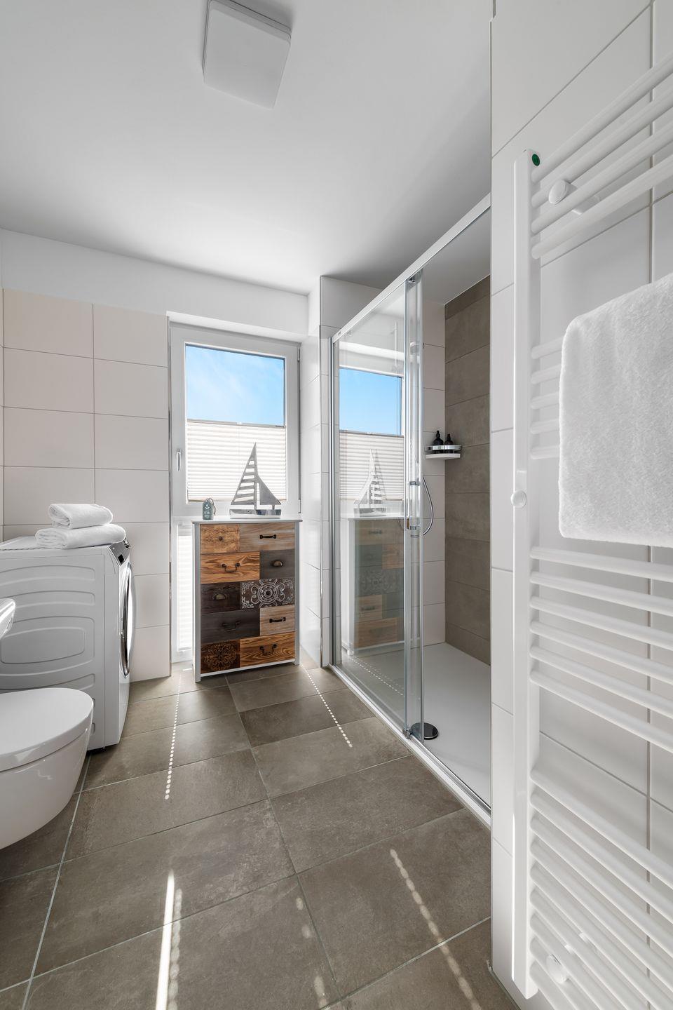 Das Badezimmer bietet mit einer großzügigen Regendusche eine angenehme Atmosphäre.
