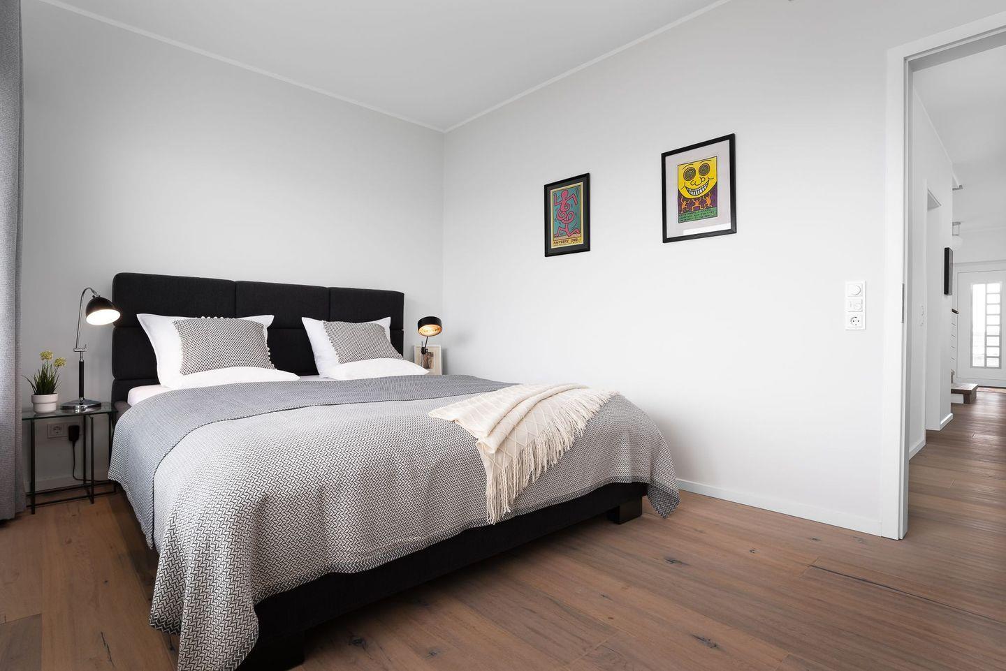 Im Erdgeschoss befindet sich der wundervolle Masterbedroom, welcher mit seinen großen Panoramafenstern direkten Ostseeblick beim Aufwachen verspricht. Das lichtdurchflutete, großzügige Badezimmer kann direkt vom Schlafzimmer aus betreten werden und bietet Wellness und Entspannung pur. Die frei stehende Badewanne vor dem großen Fenster ermöglicht beim Baden den Blick auf das Meer. Eine große finnische Sauna, eine Raindancedusche, Doppelwaschtisch und WC befinden sich ebenfalls in diesem luxuriösen Wellnesstempel.