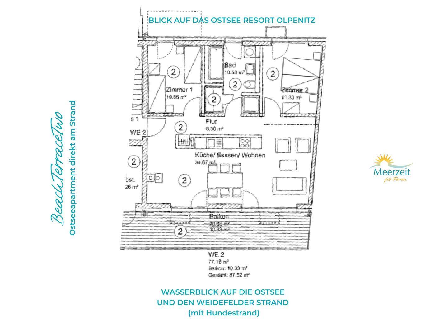 Luxusferienwohnung "BeachTerraceTwo", im Erdgeschoss, direkt am Weidefelder Strand mit Panoramafenstern und Meerblickterrasse. Der großzügige Wohn-Essbereich, integrierte Küche und Kamin bieten ideale Bedingungen für gemütliche Stunden. Zwei Schlafzimmer mit Boxspringbetten, eine Badewanne und eine finnische Sauna sorgen für Erholung im Urlaub. Die Terrasse und der nahegelegene Ostseestrand laden zum Entspannen ein. Ein Parkplätz und eine E-Ladestation sind vor Ort. Ihr Hund ist willkommen!