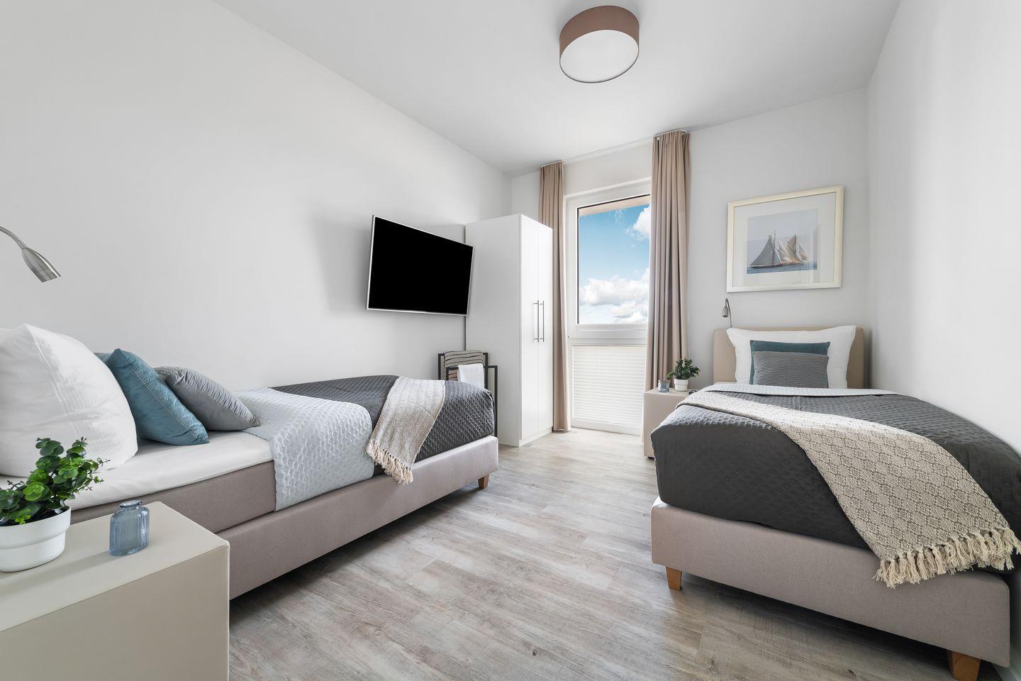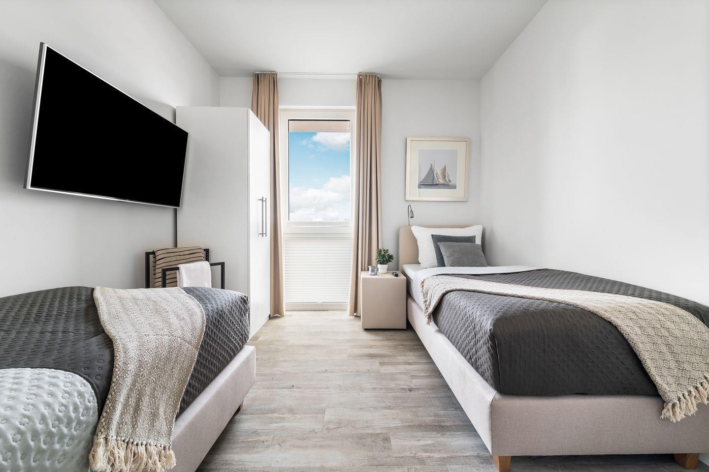 Das Apartment "BeachTerraceTwo“, bietet zwei Schlafzimmer, ausgestattet mit hochwertigen Boxspringbetten für einen erholsamen Schlaf. Entspannen Sie sich in der finnischen Sauna oder genießen Sie ein Bad in der großzügigen Wanne.