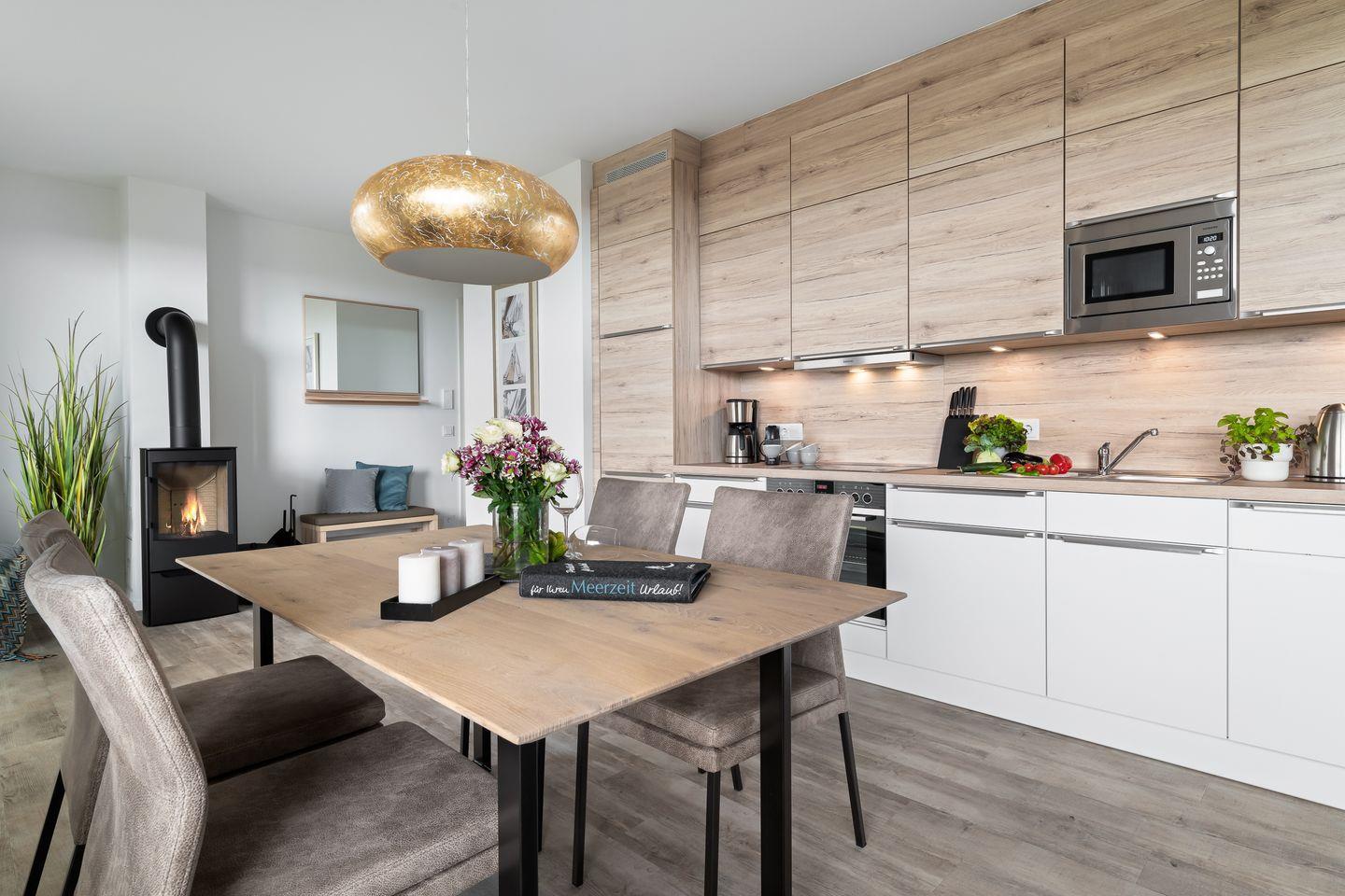 Der großzügige Wohn- und Essbereich ist der perfekte Ort für gesellige Stunden. Ausgestattet mit einer vollintegrierten Küche, können Sie hier leckere Mahlzeiten für Familie und Freunde zubereiten, während Sie den Blick auf die vorbeiziehenden Segelboote genießen. In der kühleren Jahreszeit sorgt der Kamin für gemütliche Atmosphäre.