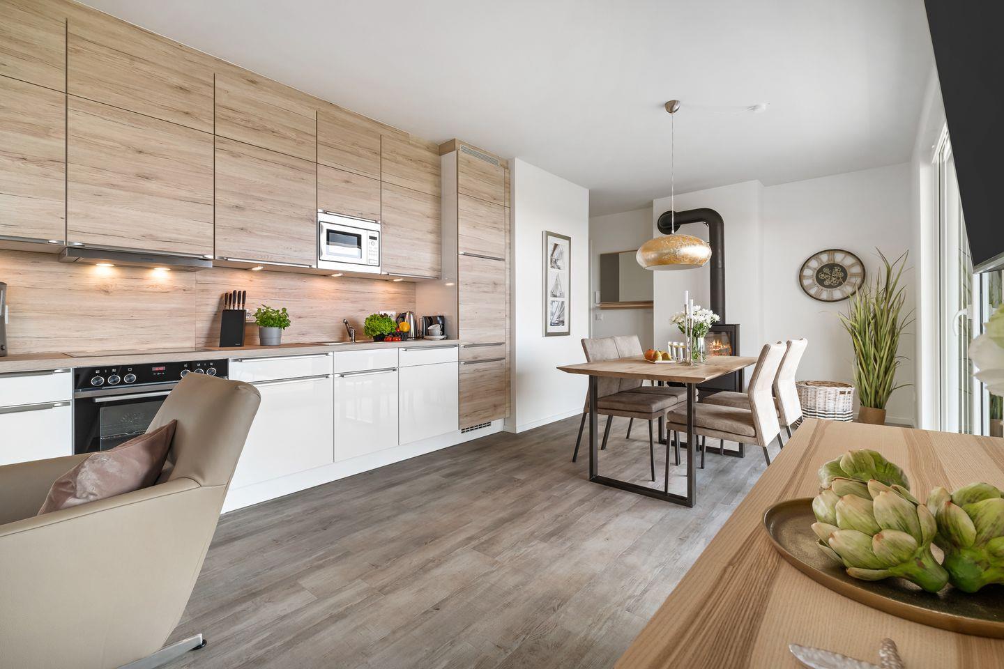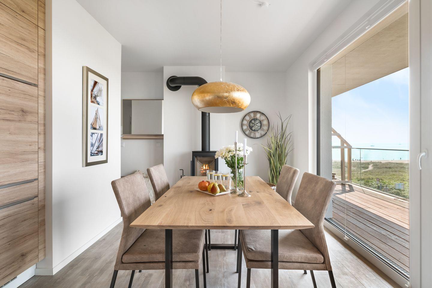 Der großzügige Wohn- und Essbereich ist der perfekte Ort für gesellige Stunden. Ausgestattet mit einer vollintegrierten Küche, können Sie hier leckere Mahlzeiten für Familie und Freunde zubereiten, während Sie den Blick auf die vorbeiziehenden Segelboote genießen. In der kühleren Jahreszeit sorgt der Kamin für gemütliche Atmosphäre.