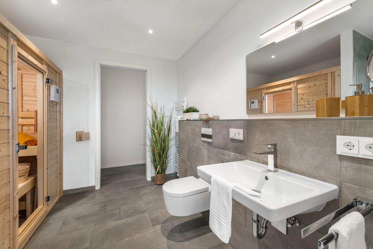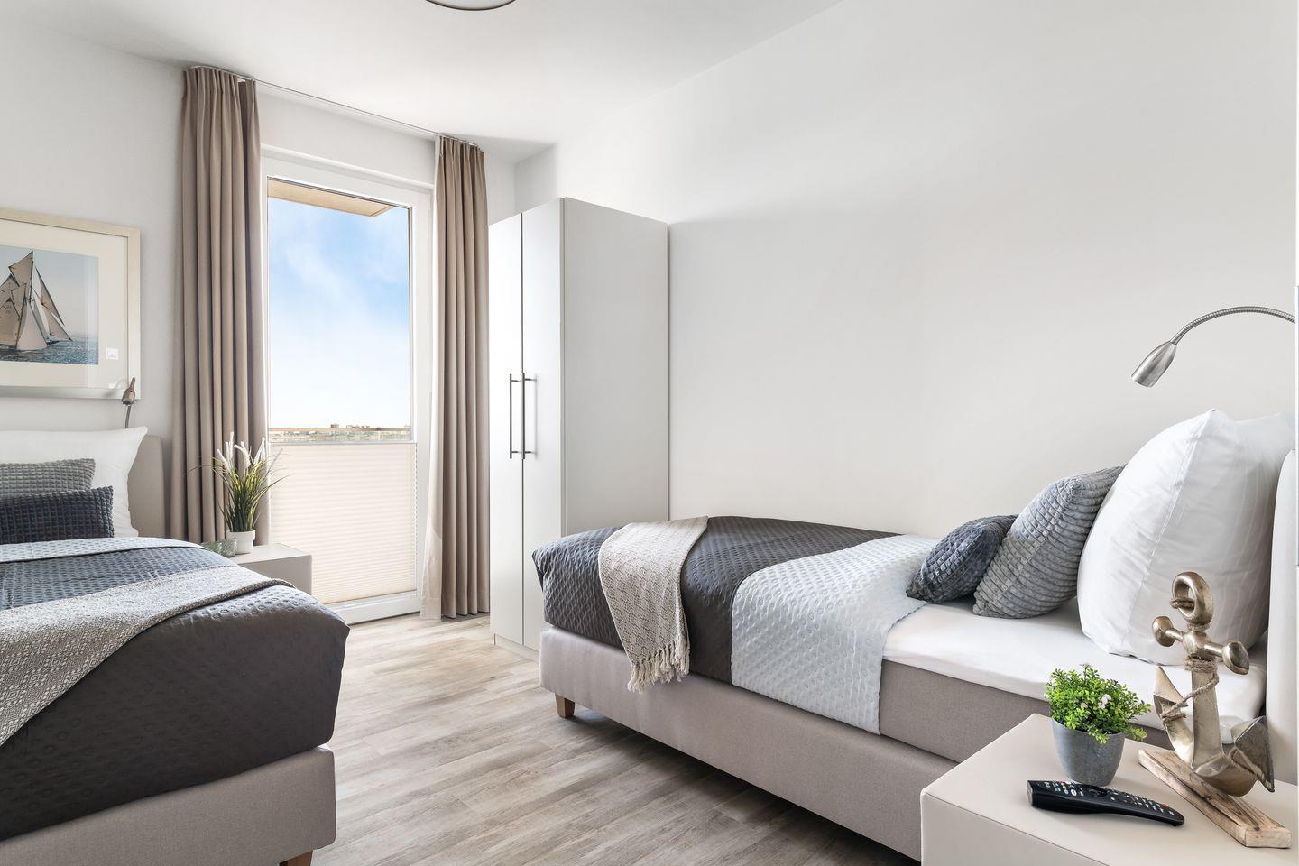 Das Apartment "BeachWaveThree" bietet zwei Schlafzimmer, ausgestattet mit hochwertigen Boxspringbetten für einen erholsamen Schlaf. Entspannen Sie sich in der finnischen Sauna oder genießen Sie ein Bad in der großzügigen Wanne.