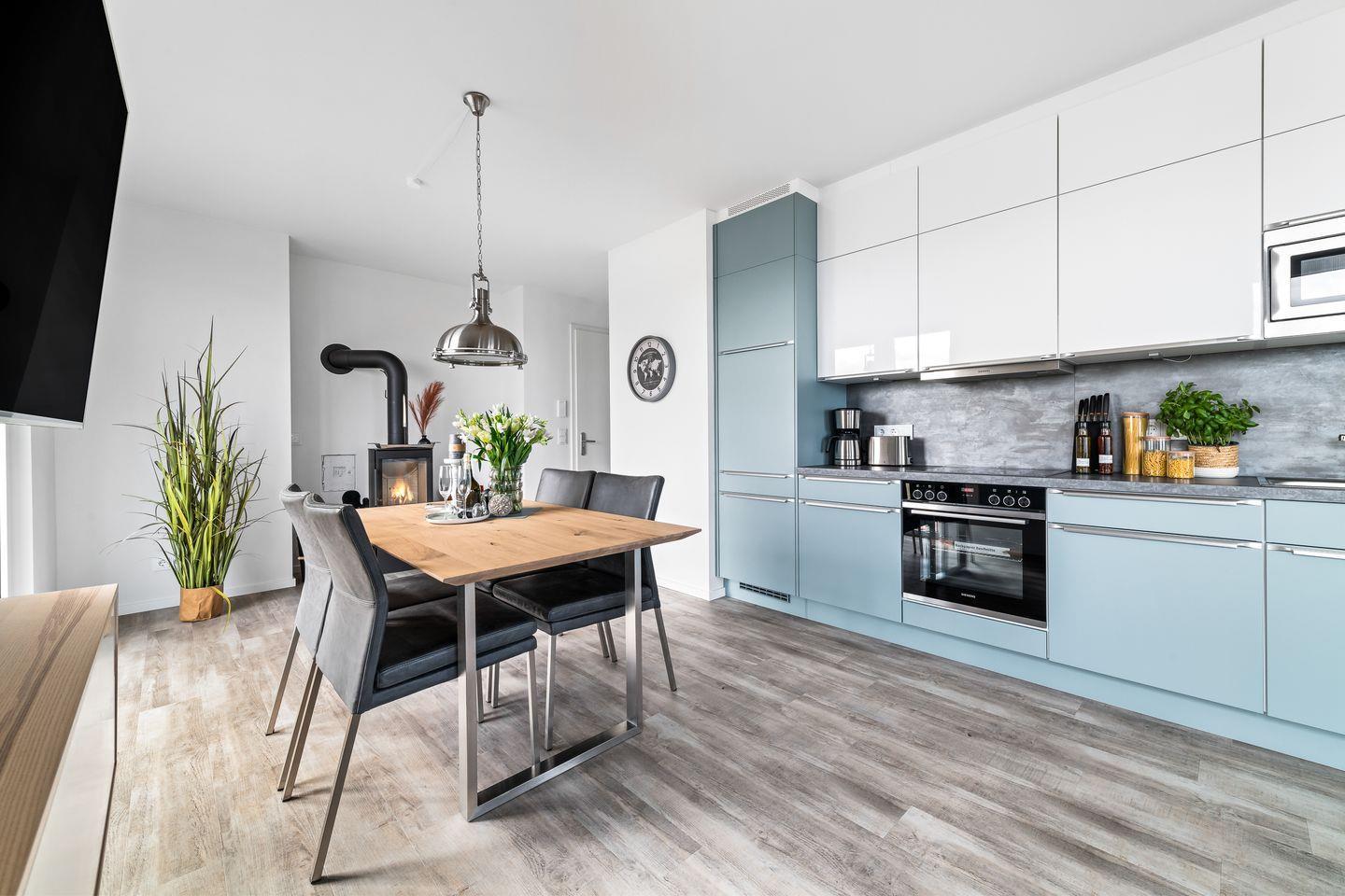 Der großzügige Wohn- und Essbereich ist der perfekte Ort für gesellige Stunden. Ausgestattet mit einer vollintegrierten Küche, können Sie hier leckere Mahlzeiten für Familie und Freunde zubereiten, während Sie den Blick auf die vorbeiziehenden Segelboote genießen. In der kühleren Jahreszeit sorgt der Kamin für gemütliche Atmosphäre.