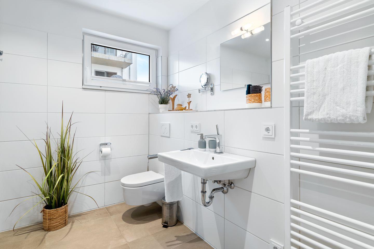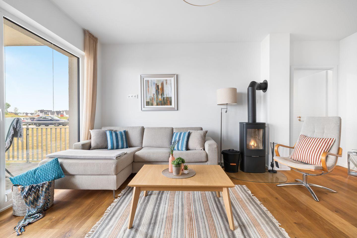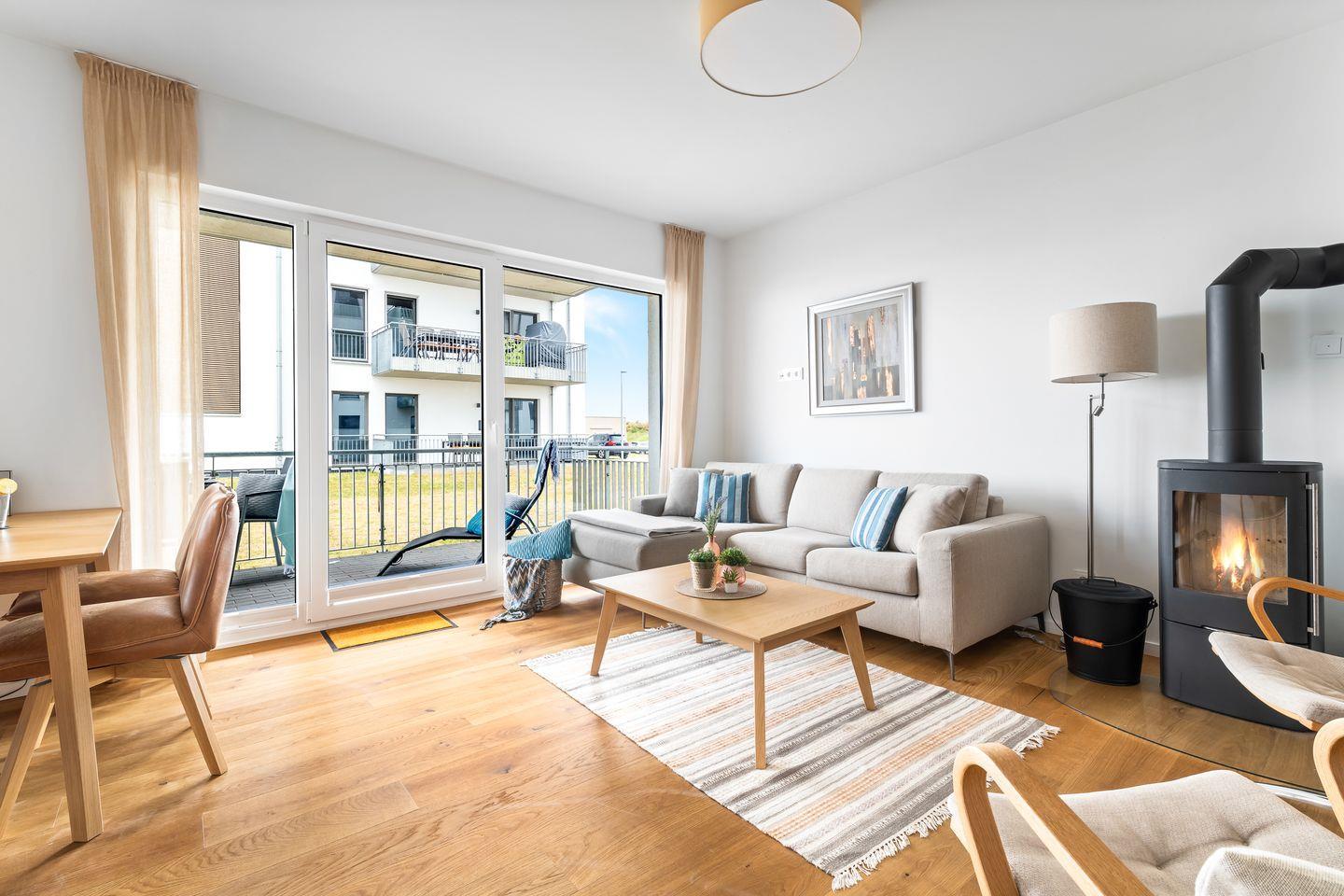 Der Wohnbereich ist mit hellen Möbeln und hochwertigem Parkettboden ausgestattet, sodass das Apartment ein nordisch elegantes Flair versprüht. Bequeme Sitzmöbel und ein Kaminofen laden – auch an „Schietwetter"- Tagen - zum Entspannen ein. Mit einem Glas Rotwein in der Hand und knisterndem Kaminfeuer im Hintergrund ist die Urlaubsstimmung perfekt.