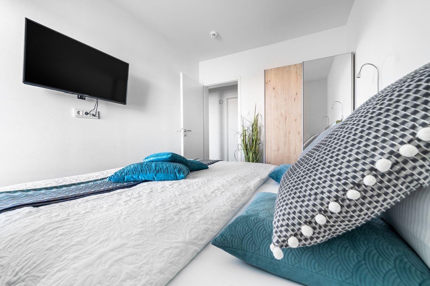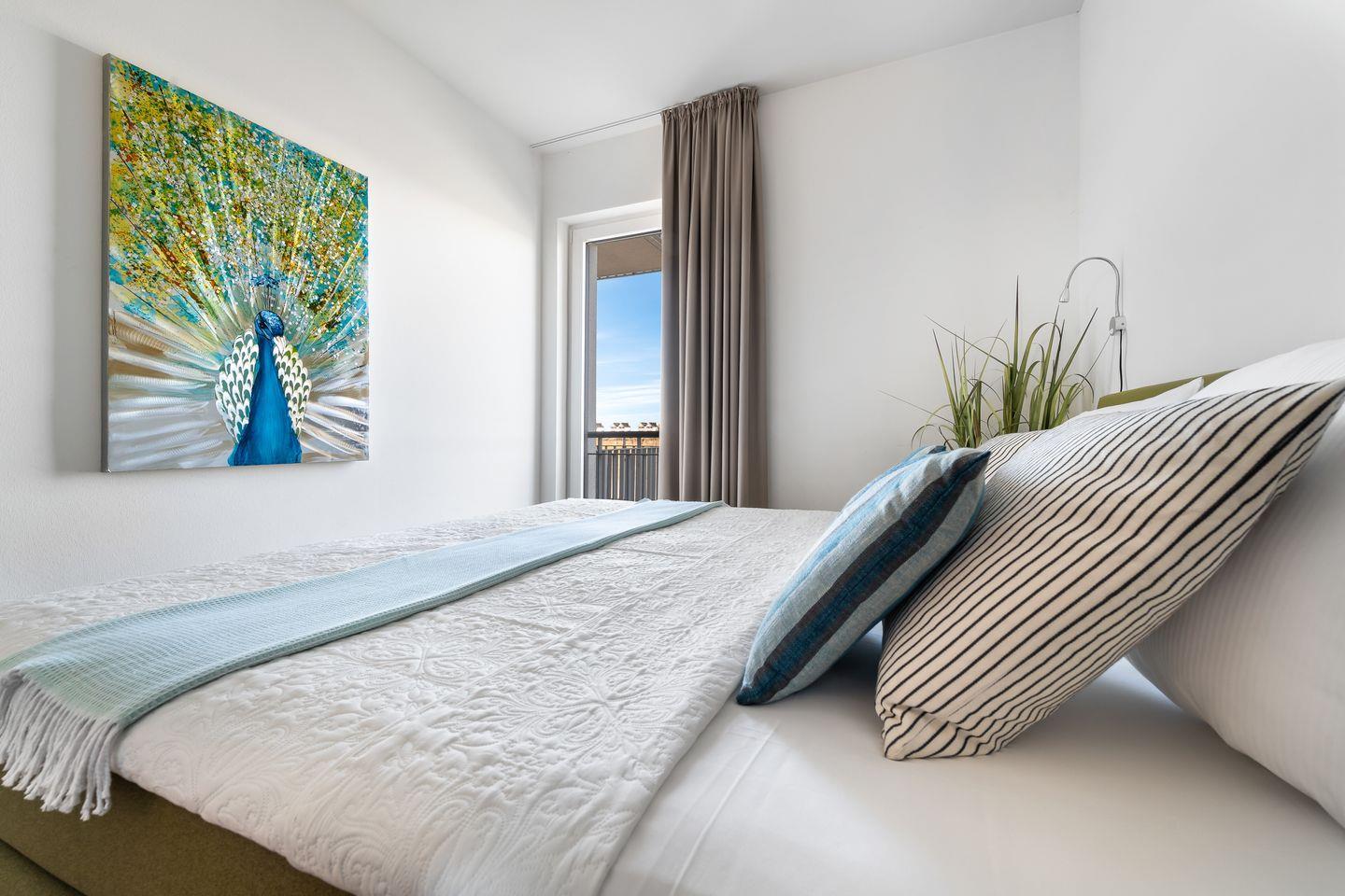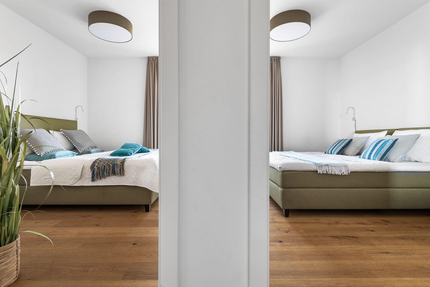 Die Schlafzimmer erwarten unsere Gäste mit hellen Erd- und Grüntönen. Große Boxspringbetten und bodentiefe Fenster, die sich durch Gardinen abdunkeln lassen, versprechen hier geruhsame Nächte.