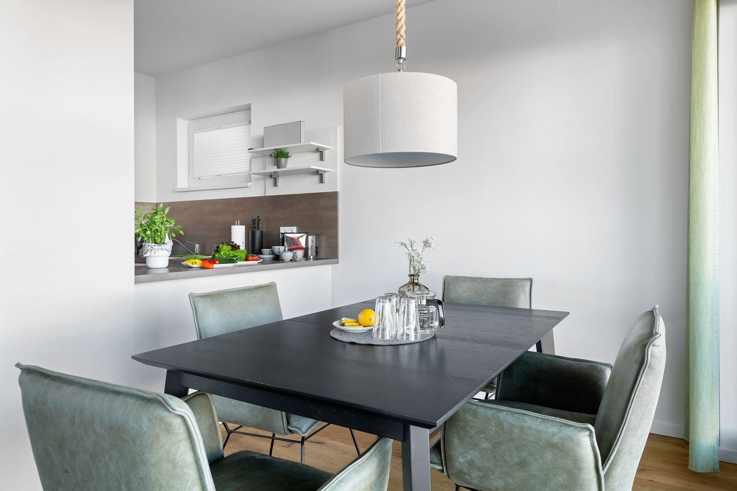 Der Koch- und Essbereich, in den eine hochwertig ausgestattete Einbauküche integriert ist, bietet den idealen Ort für gemeinsame Kochabende. Hier lässt sich das Zubereiten von Köstlichkeiten und das gemütliche Beisammensein herrlich vereinbaren.
