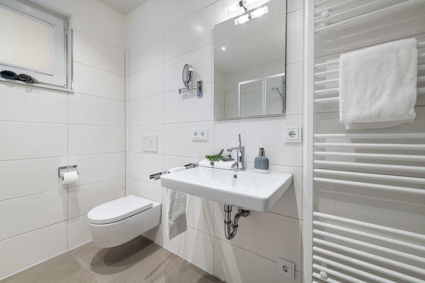 Im Badezimmer steht alles zur Verfügung, was man zur Urlaubsentspannung braucht. Besonders die Whirlwanne und Fußbodenheizung lädt nach einem ereignisreichen Urlaubstag zum Relaxen ein.