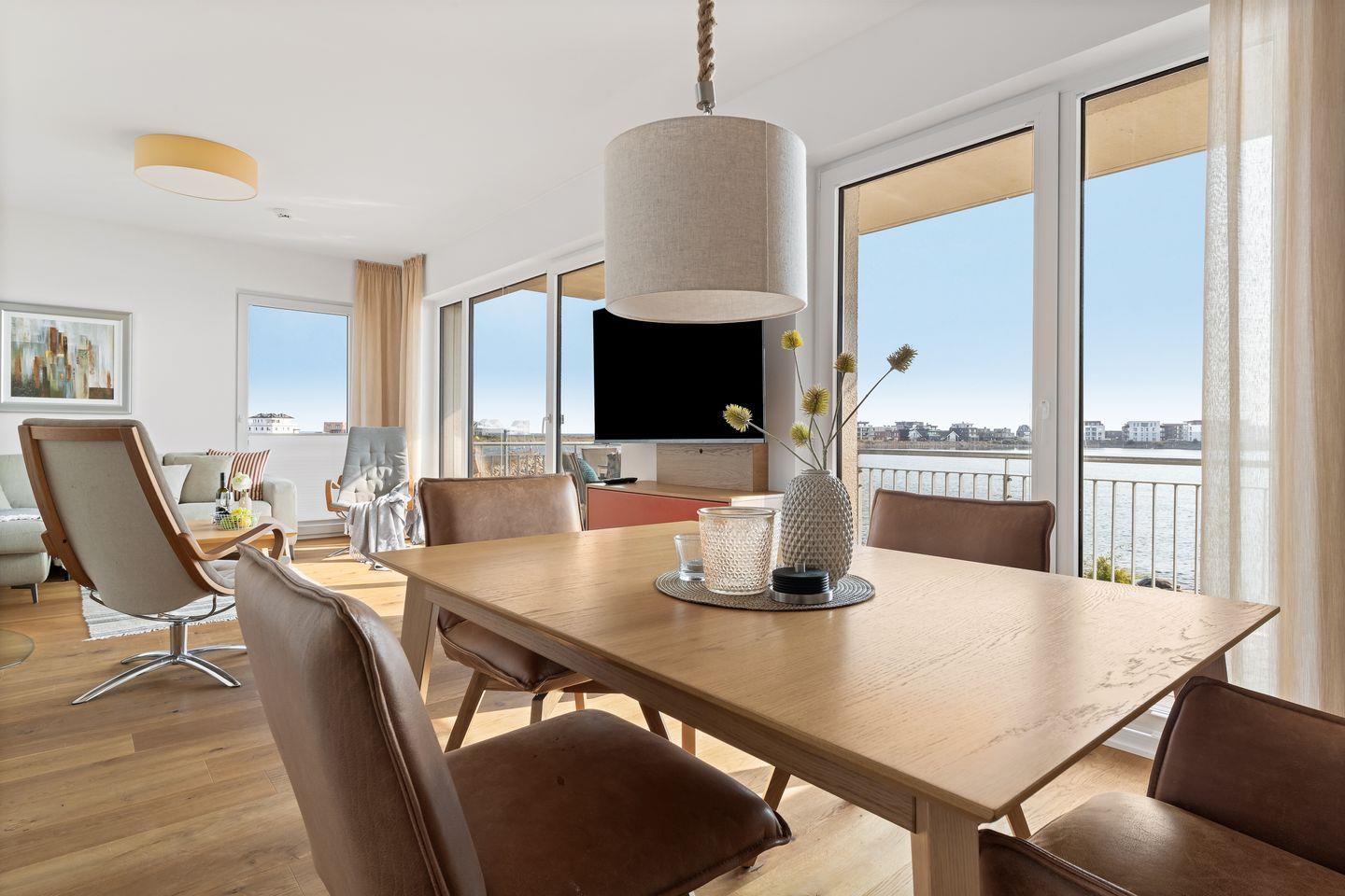 Der traumhafte Balkon bietet einen weiten Blick auf das Hafenkino und die vorbeiziehenden Segelschiffe. Eine hochwertige Sitzgarnitur sowie Sonnenliegen stehen bereit um erholsame Sonnenstunden zu genießen. Ob beim morgendliche Kaffee oder einer gemütlichen Grillerei, hier wird das Urlaubsfeeling perfekt.