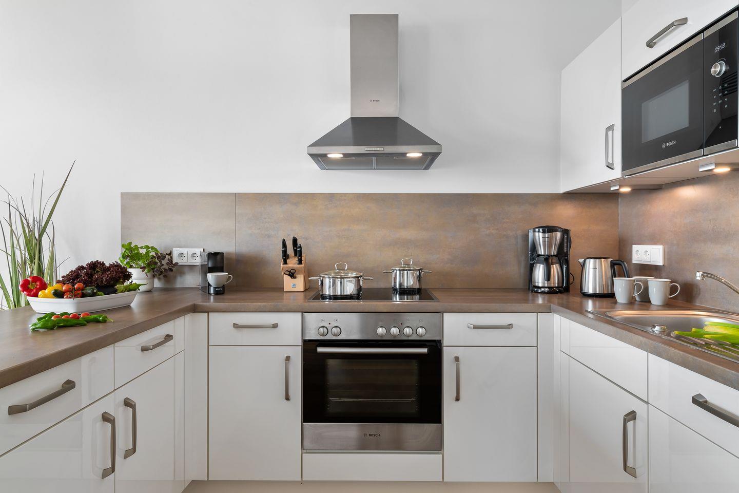 Auch die hochwertige und voll ausgestattete Einbauküche lässt keine Wünsche offen, „Kochen mit Blick ins Blaue" ist hier das Motto! Durch den direkt anschließenden Essbereich lassen sich gemütliches Beisammensein und das Zubereiten von Köstlichkeiten perfekt vereinbaren.