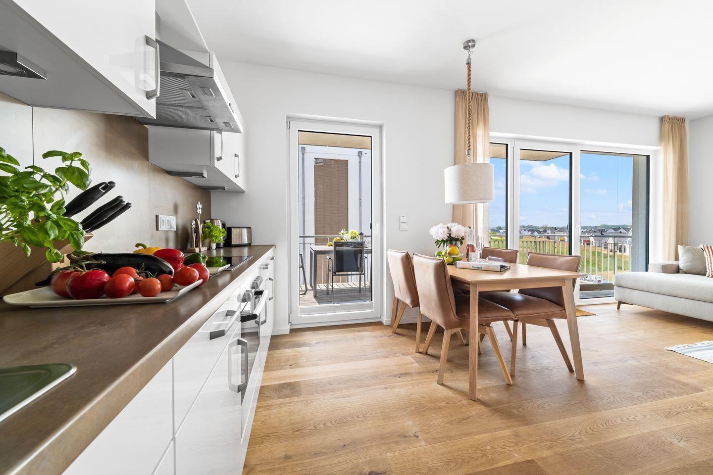 An den Wohnbereich grenzt der offene Koch- und Essbereich an. Eine vollausgestattete Einbauküche mit allem, was das Herz eines Hobbykochs begehrt, wartet hier auf unsere Gäste. Am großen Esstisch findet jeder seinen Platz, ob beim gemütlichen Abendessen oder einem Spieleabend.