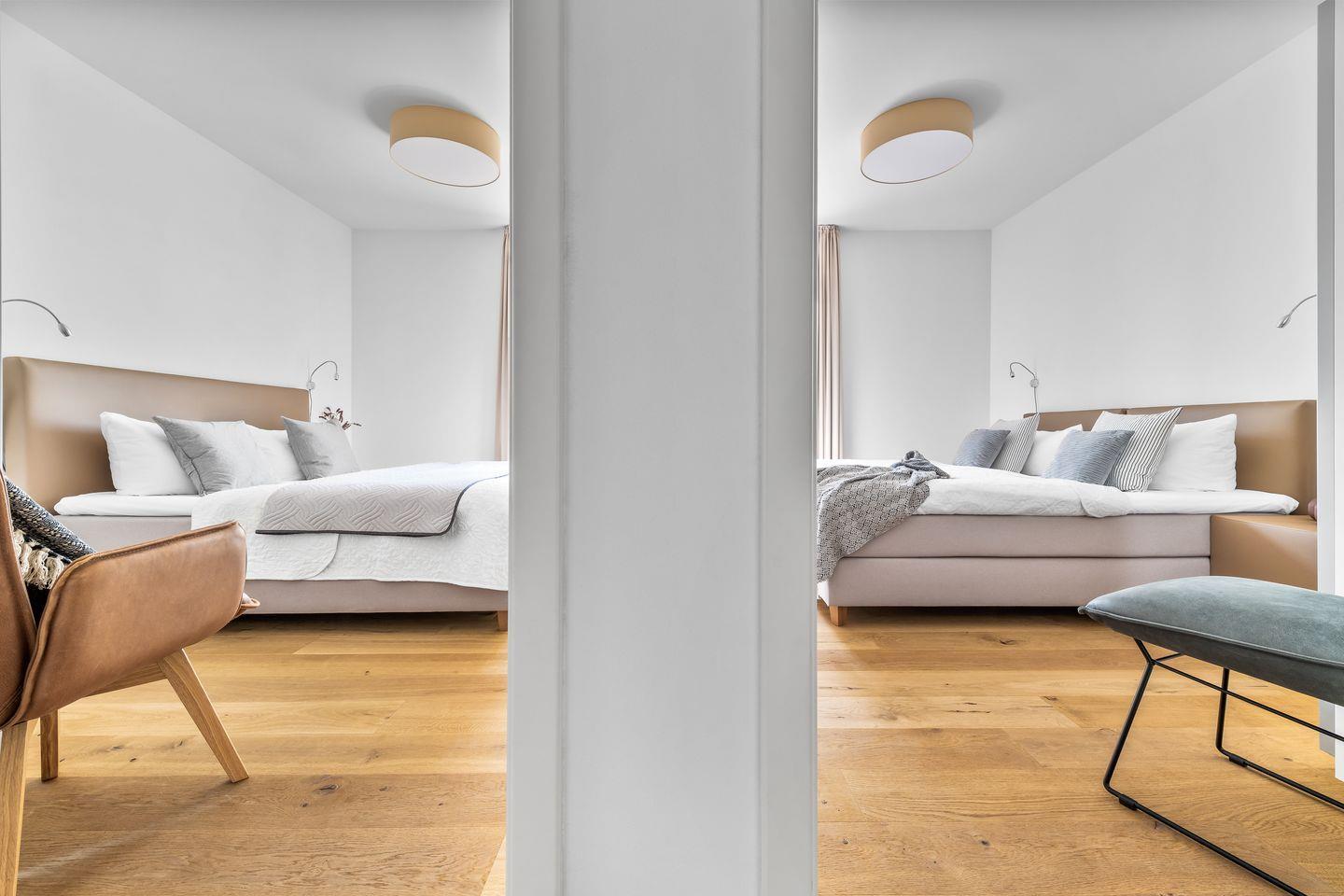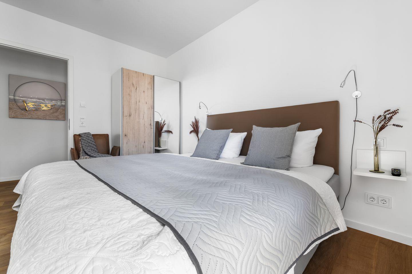 Die hellen Schlafzimmer verfügen über hochwertige Boxspringbetten und bodentiefe Fenster, die sich durch Gardinen abdunkeln lassen. Für Entertainment sorgt in einem der Schlafzimmer ein Flatscreen.