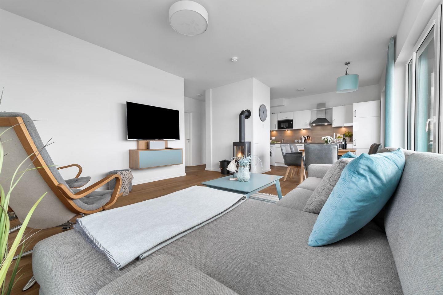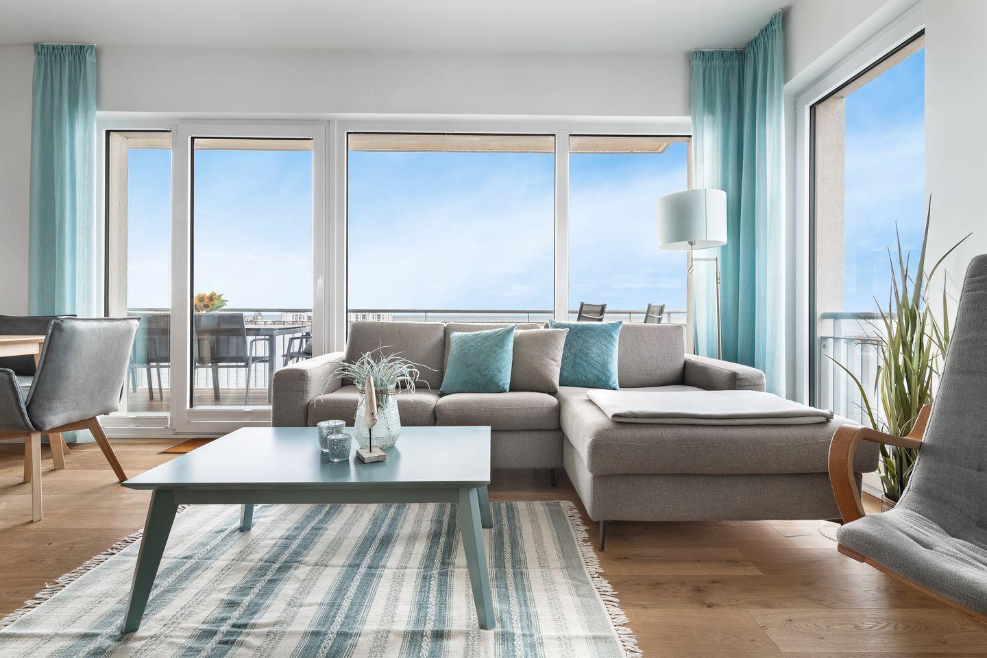 Das elegant maritim eingerichtete Apartment "Ocean Sunrise" besticht besonders durch den traumhaft freien Blick auf die Ostsee. Durch die komplett verglaste Front des Koch- und Wohnbereichs fällt der Blick immer ins Blaue, während man es sich auf den bequemen Sitzmöbeln gemütlich macht. Ein Kamin trägt, besonders in der kalten Jahreszeit, zur wohligen Stimmung bei. Mit einem Glas Wein in der Hand vor knisterndem Kaminfeuer, während draußen die Ostsee tobt - was gibt es Schöneres?