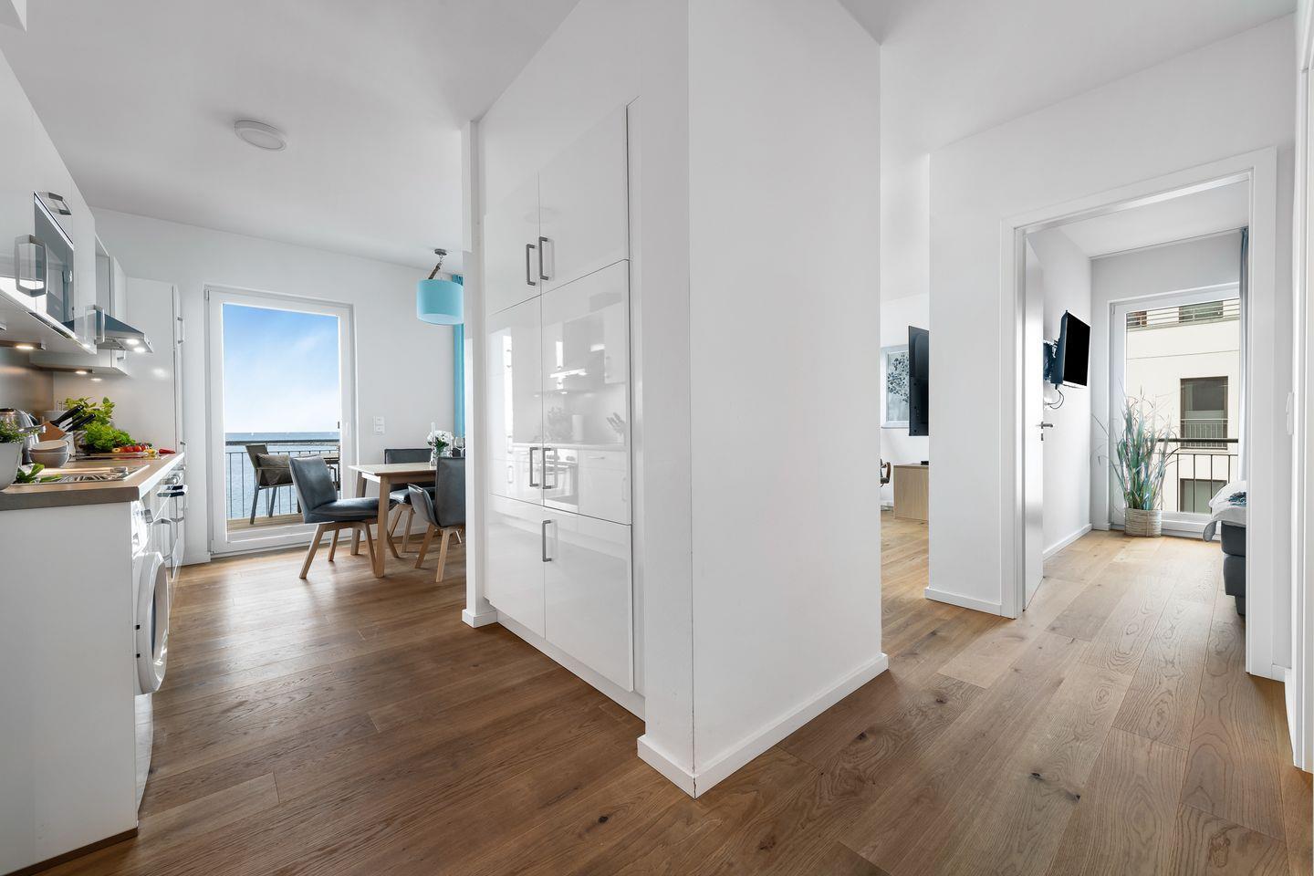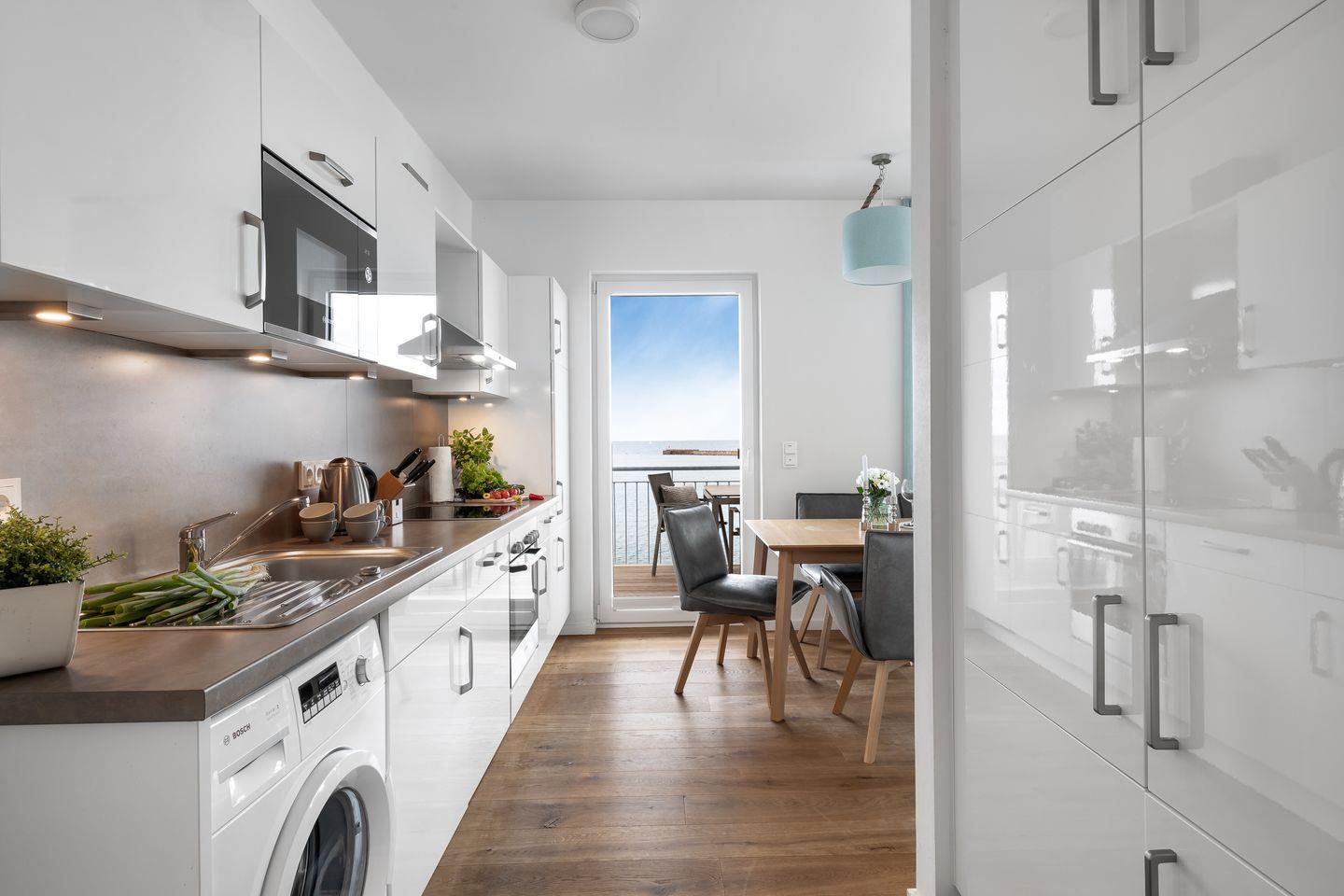 Die offene, moderne Einbauküche bietet alles, was das Hobbykoch-Herz begehrt! Die frisch zubereiteten Köstlichkeiten können im Anschluss mit herrlichem Meerblick am direkt angrenzenden Esstisch oder auf dem großzügigen Balkon verspeist werden. Außerdem bietet der Balkon den perfekten Ort für ein herrliches Sonnenbad. Hier ist Urlaubsstimmung vorprogrammiert!