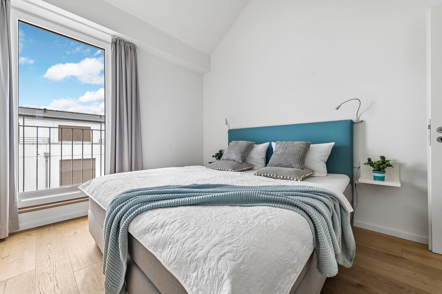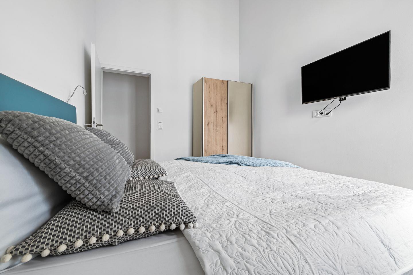 Drei Schlafzimmer mit bodentiefen Fenstern, welche sich durch Gardinen abdunkeln lassen, und bequemen Boxspringbetten versprechen geruhsame Nächte. Eines der Schlafzimmer ist mit einem Flatscreen ausgestattet.
