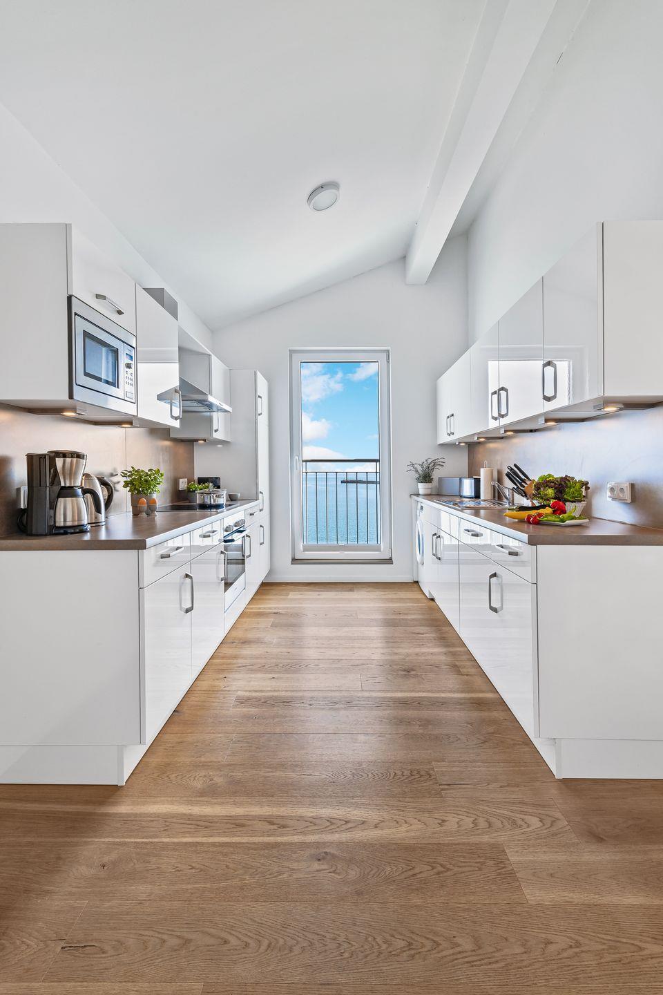 Aus dem Wohnbereich gelangt man direkt in den Koch- und Essbereich, von wo aus man ebenfalls das Meer im Blick hat - mehr Meerzeit geht nicht! Die moderne Küche ist voll ausgestattet und bietet alles, was das kulinarische Herz begehrt. Durch die offen gestalteten Räume besteht die Möglichkeit, gemütliches Beisammensein und das Zubereiten von tollen Speisen zu verbinden.