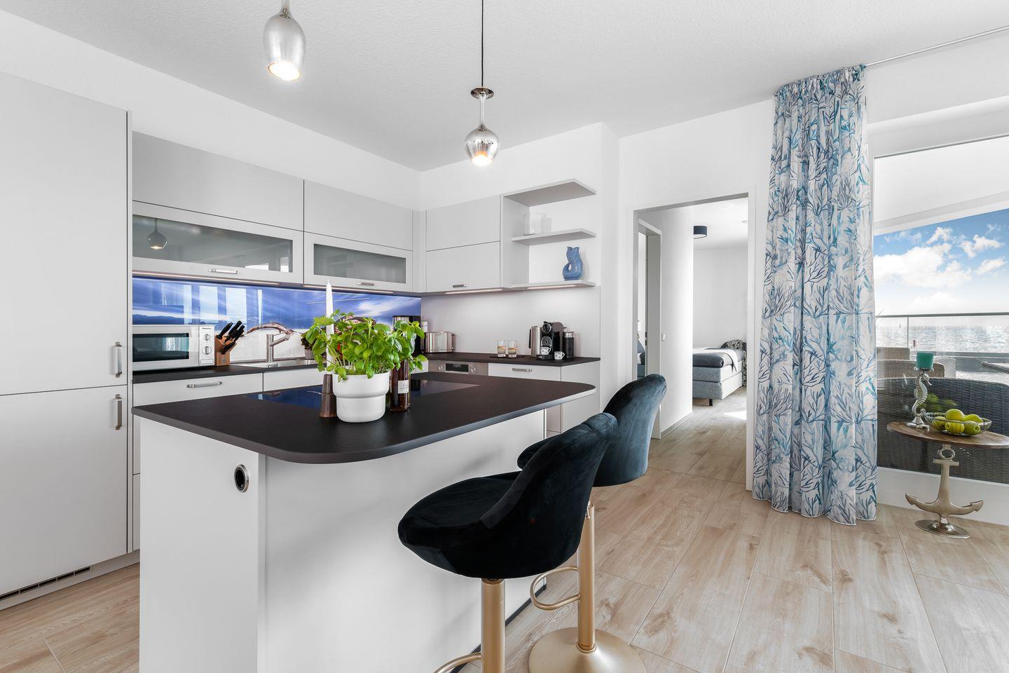 Ein kleiner Treppenaufgang führt von dort aus zum Eingang. Die, im dritten Obergeschoss gelegene Wohnung Hafenloge, ist bequem per Fahrstuhl erreichbar und für bis zu vier Personen buchbar. Durch die Tür betritt man den großzügig gestalteten Koch- und Essbereich, der nach hinten nahtlos in das Wohnzimmer übergeht. Eine bodentiefe Fensterfront über den kompletten Bereich hinweg sorgt für Helligkeit. Die modern und voll ausgestattete Küche ist mit allem ausgestattet, was Hobbyköche sich wünschen mögen (bspw. Weinkühlschrank, DeLonghi Kapselmaschine, Mikrowelle, Geschirrspüler). Eine separate Kochinsel mit integriertem Dunstabzug und zwei davorstehenden Barhockern laden geradezu zu gemeinschaftlichen Kochevents und/oder Klönschnack ein. Die zubereiteten Mahlzeiten können dann entweder am nahen Esstisch, oder auf dem Balkon eingenommen werden.