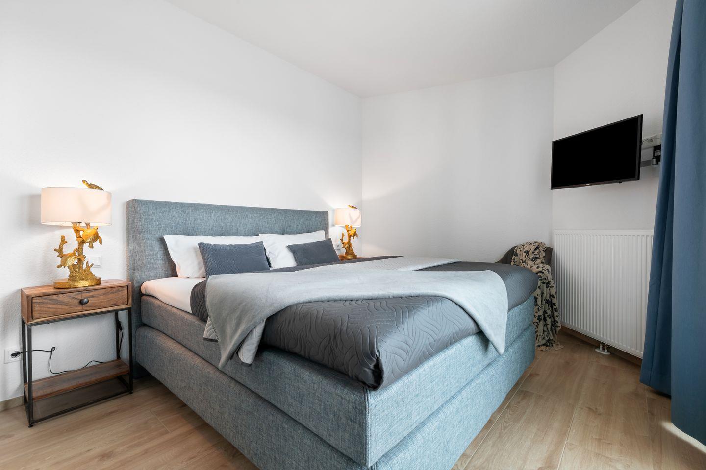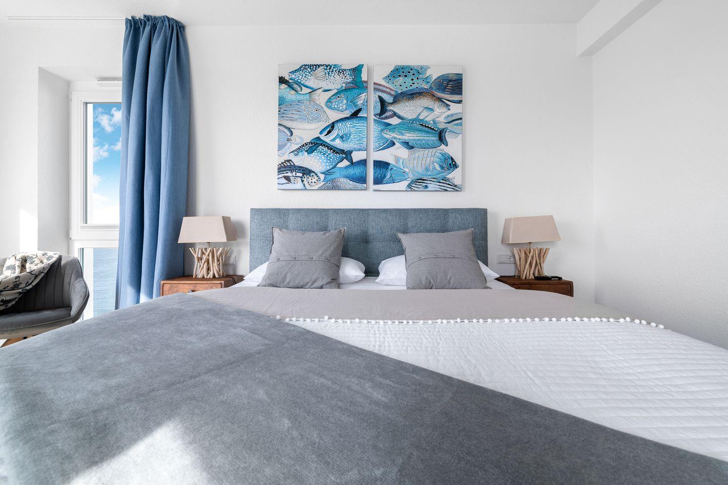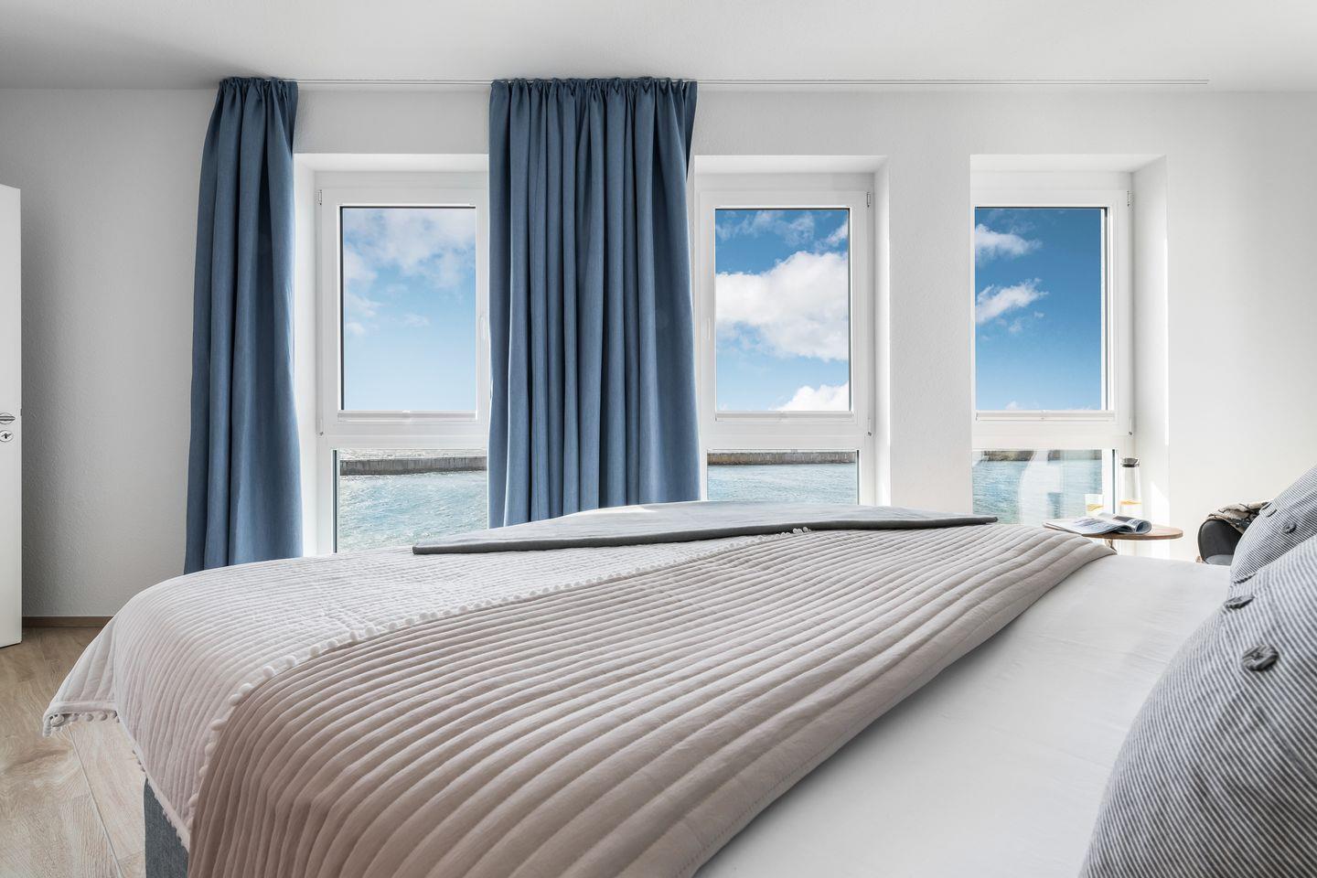 Doppel-Boxspringbetten garantieren einen angenehmen und erholsamen Schlaf. Die bodentiefen Fenster, die in beiden Schlafzimmern freie Sicht auf das Wasser bieten, lassen sich mithilfe von Gardinen verdunkeln.
