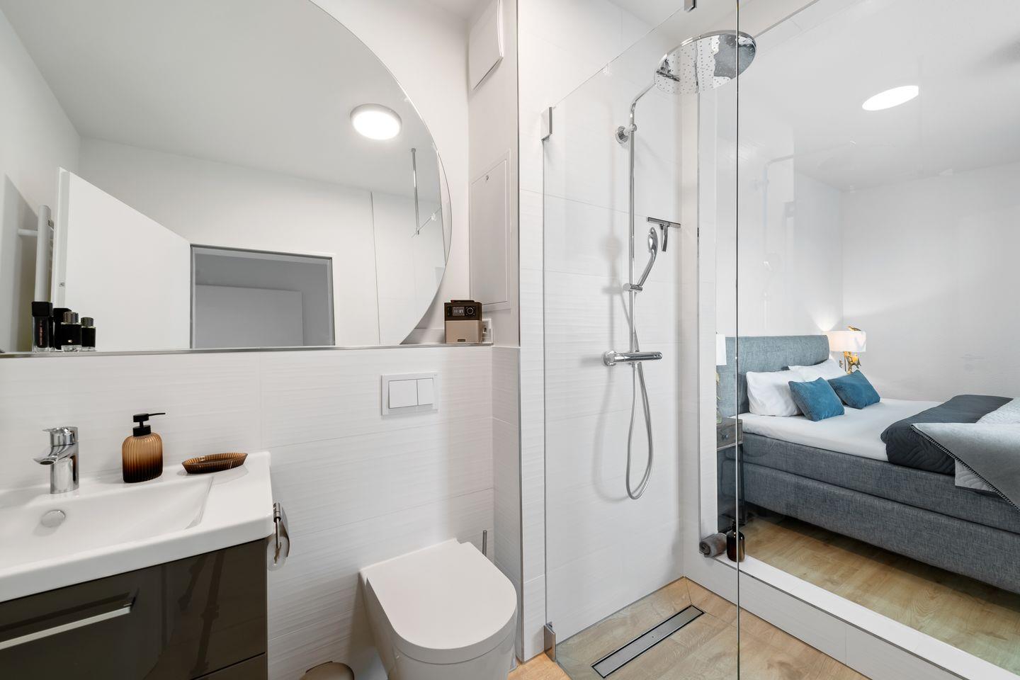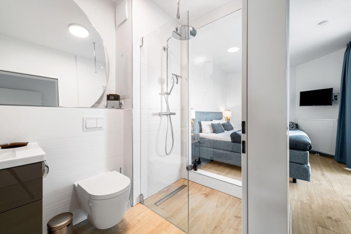 Auf der rechten, bzw. linken, Seite des Appartements befinden sich die beiden Schlafzimmer mit jeweils einem eigenen Bad. Eine bodengleiche Rainshower-Dusche sorgt für ein prickelndes Spa-Erlebnis. Ein Waschbecken, WC, Handtuchheizkörper, Föhn, Radio und ein großer, im Hintergrund beleuchteter Spiegel, runden die hochwertige Ausstattung ab.