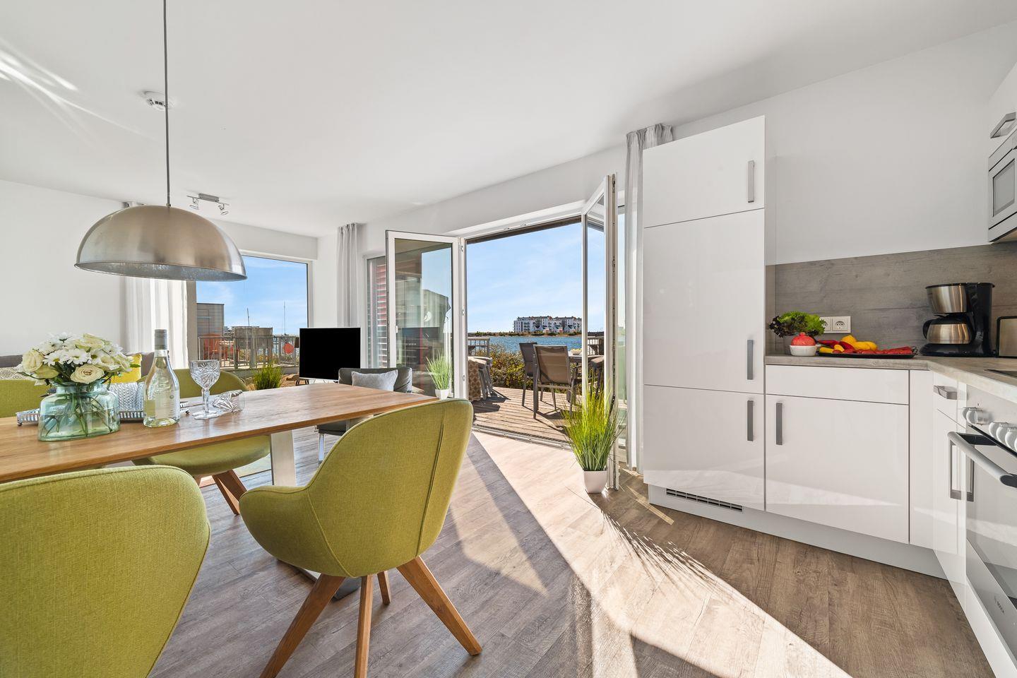 Der helle und freundliche Wohn- und Essbereich verfügt über bodentiefe Fensterfronten mit wunderbarem Blick auf die Terrasse und den davorliegenden Yachthafen. Die nach Süden ausgerichtete Terrasse ist direkt von dem Wohnbereich zugänglich und lädt ganztags zum Entspannen im eigenen Strandkorb oder einem gemütlichen Essen beim Sonnenuntergang ein.