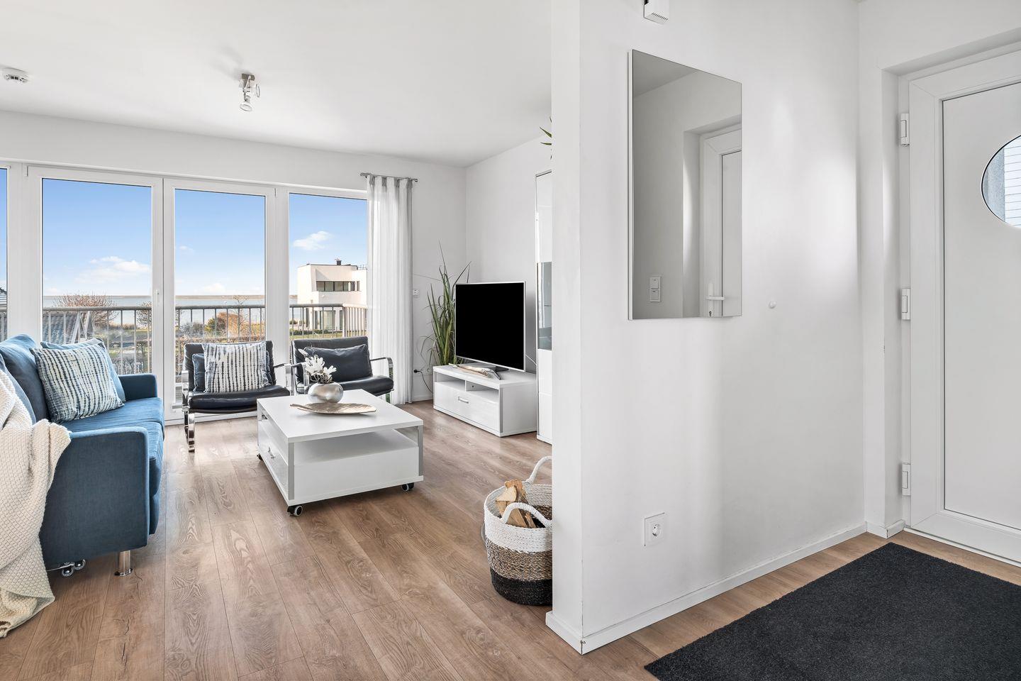 Im Wohnzimmer verlockt ein großer Smart-TV, ein Kaminofen und ein gemütliches Zweier-Stoffsofa und zwei lederbezogenen Clubsesseln, zum längeren Verweilen und Ausspannen. Das Wohnzimmer, wie auch der Balkon, sind der Landseite hin zugewandt. Von hier aus kann man in Sichtweite die auf der Schlei vorbeiziehenden Segelschiffe und Ausflugsdampfer beobachten.