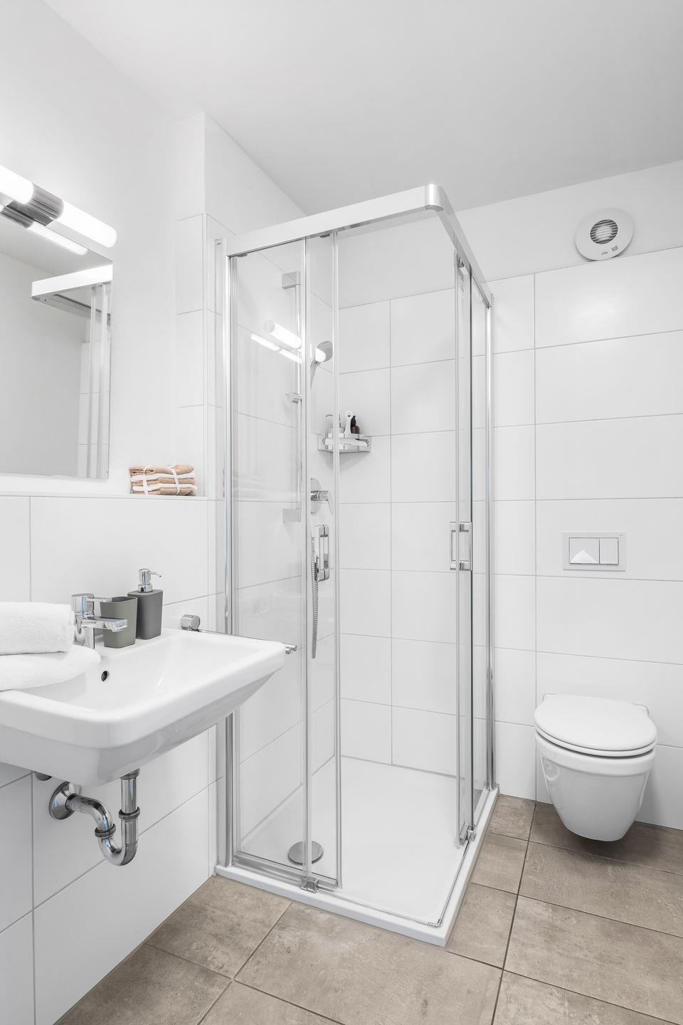 Hinter der Eingangstür befindet sich ein kleiner Flur mit Garderobe, Sitzbank und einem Schuhschrank. Offene Durchgänge führen jeweils seitlich in den hellen und geräumigen Wohn-, bzw. Küchen-/Essbereich. Dazwischen befindet sich ein kleines Bad mit Dusche und WC, welches für zusätzlichen Komfort der Gäste sorgt.