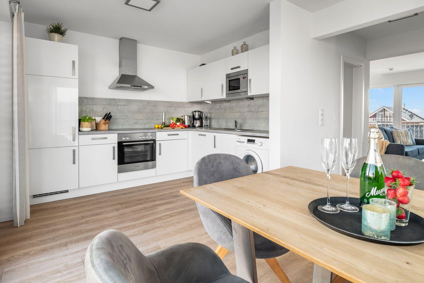 Auf der gegenüberliegenden Seite wartet die modern und voll ausgestattete Küche mit allem auf, was kreatives Kochen auch im Urlaub möglich macht. Die dort zubereiteten Köstlichkeiten können dann gemeinsam im nebenan liegenden Esszimmer verzehrt werden. Der große Esstisch mit seinen sechs gemütlichen Stühlen spiegelt die eleganten Farben der Küche wider und dürfte mit Sicherheit auch längeren Spieleabenden standhalten.