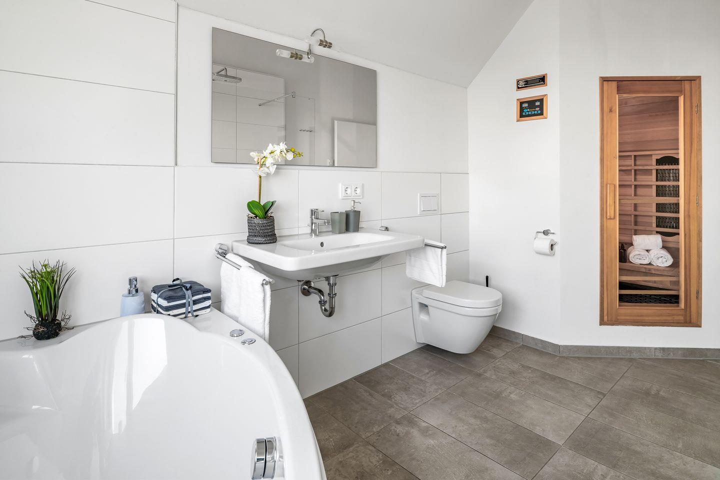 Nach einem ereignisreichen Urlaubstag verspricht das geräumige Bad mit einer bodengleichen, verglasten Rainshowerdusche, der großen Eck-Whirlbadewanne und der Infrarot-Wärme-Kabine Wellness pur. Ein Handtuchheizkörper, Waschbecken mit Spiegel, sowie ein WC vervollständigen hier die Einrichtung.
