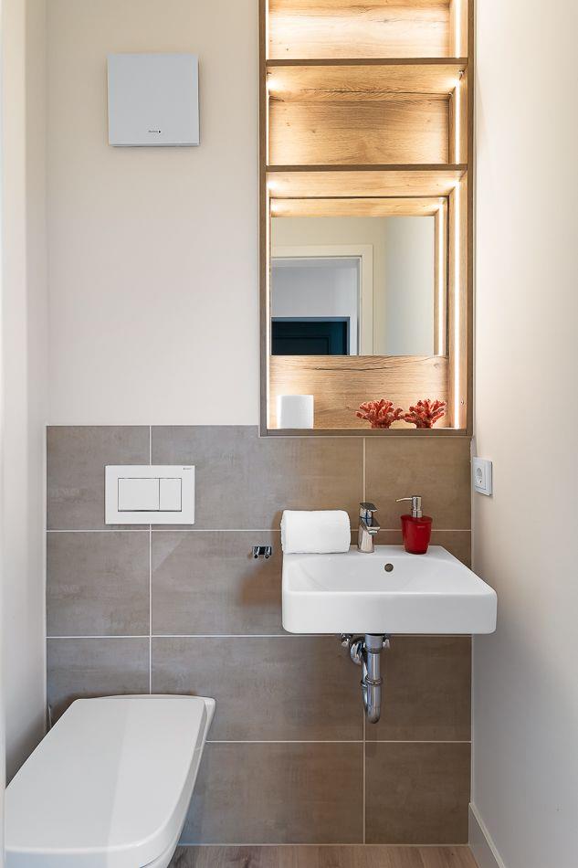 Im Obergeschoss des Ferienauses befinden sich zwei Schlafzimmer mit komfortablem Doppelbett (1,80m x 2,00m), großem Flatscreen, geräumigen Kleiderschrank und einem kleinen Sessel. In der Mitte des Obergeschosses befindet sich ein Badezimmer mit WC, Waschbecken, Spiegel, bodengleicher Dusche und toller finnischer Sauna. Das dem Wasser zugewandte Schlafzimmer verfügt zusätzlich über einen eigenen Balkon mit traumhaftem Panoramablick über den Hafen bis zur Ostsee. – Hier können Sie morgens die ersten Sonnenstrahlen genießen und den Vögeln lauschen.