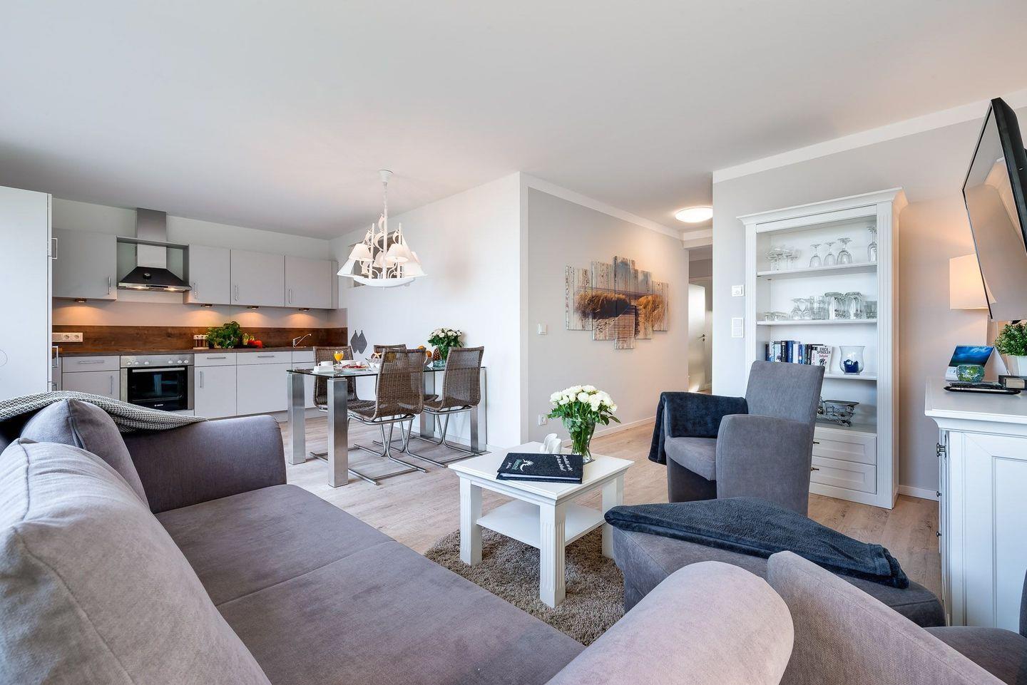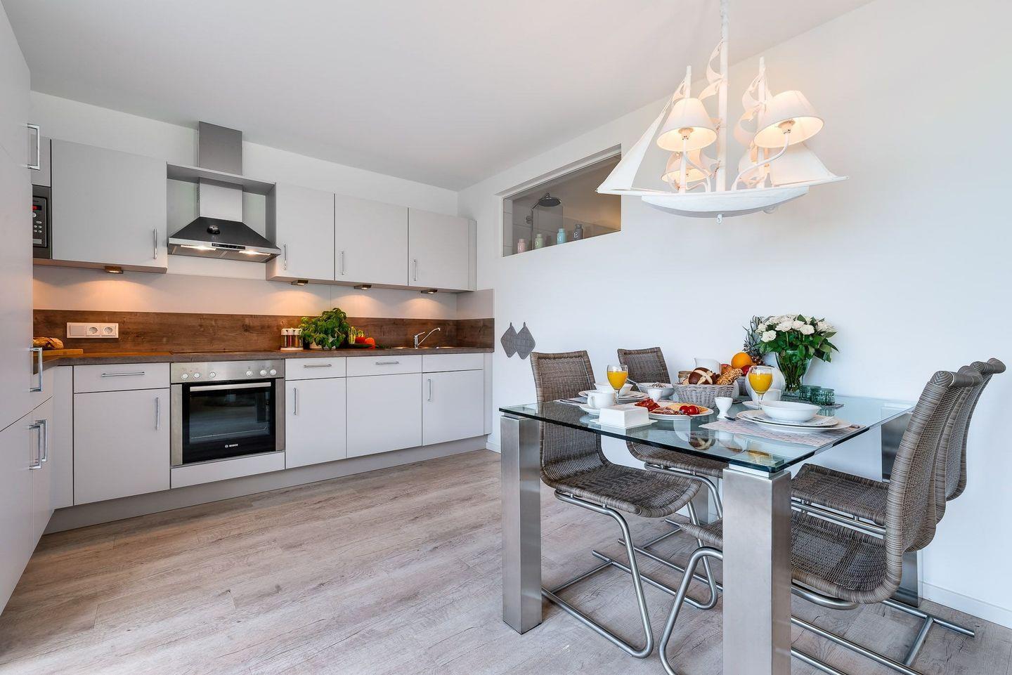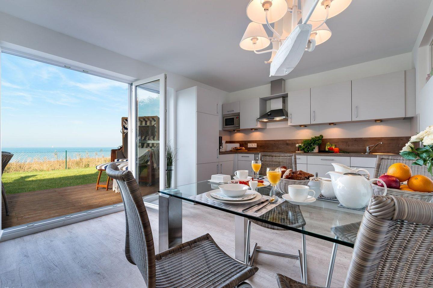 Unsere Gäste erwartet hier ein gemütlicher Esstisch für vier Personen, ein Strandkorb und zwei Sonnenliegen. Ein elektrischer Grill steht für kulinarische Genüsse bereit. Die offene und umfassend hochwertig ausgestattete Küche erfüllt alle Wünsche.