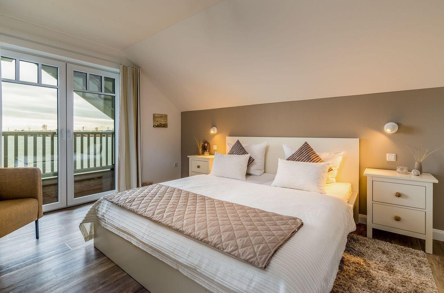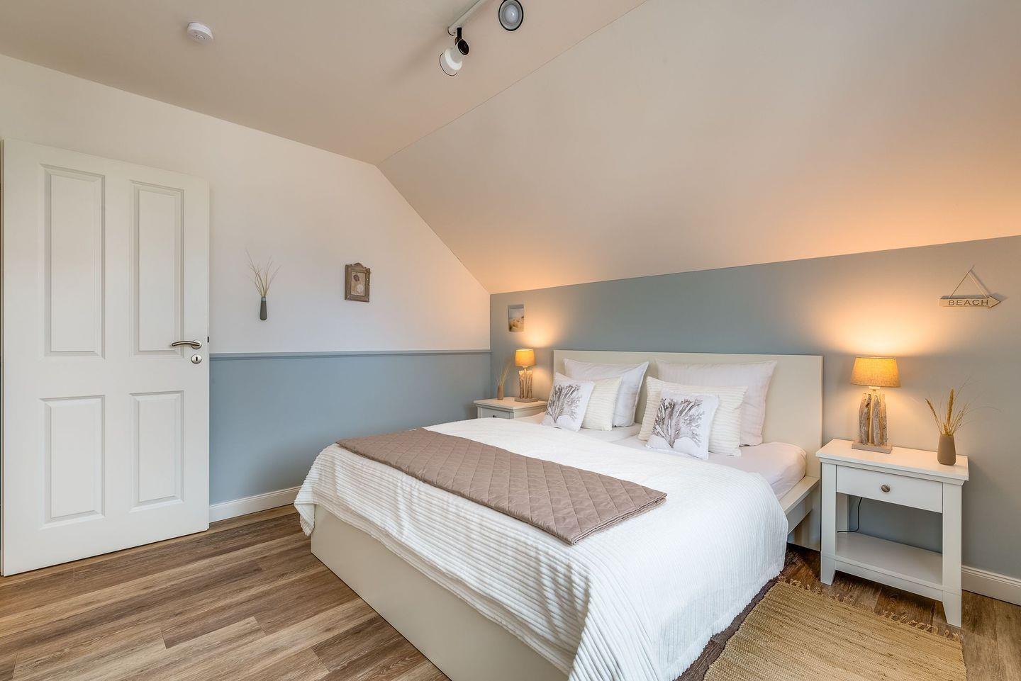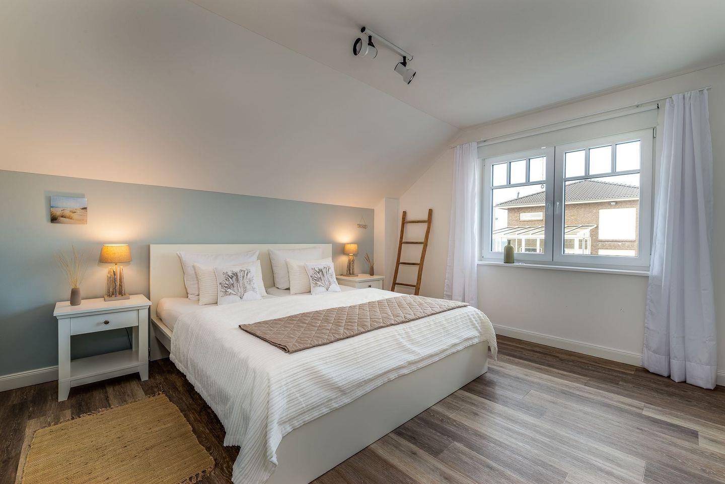 Im Obergeschoss befinden sich 3 Schlafzimmer und ein Wellnessbad mit finnischer Sauna und Frischluftbalkon. Zwei Schlafzimmer sind mit großem Doppelbett, eins mit zwei Einzelbetten ausgestattet. Die geräumigen Einbauschränke verfügen über 40 Zoll Flachbildfernseher. Der „Master-Bedroom" mit bodentiefen Fenstern hat Zugang zum nach Süden ausgerichteten Balkon mit Meerblick.