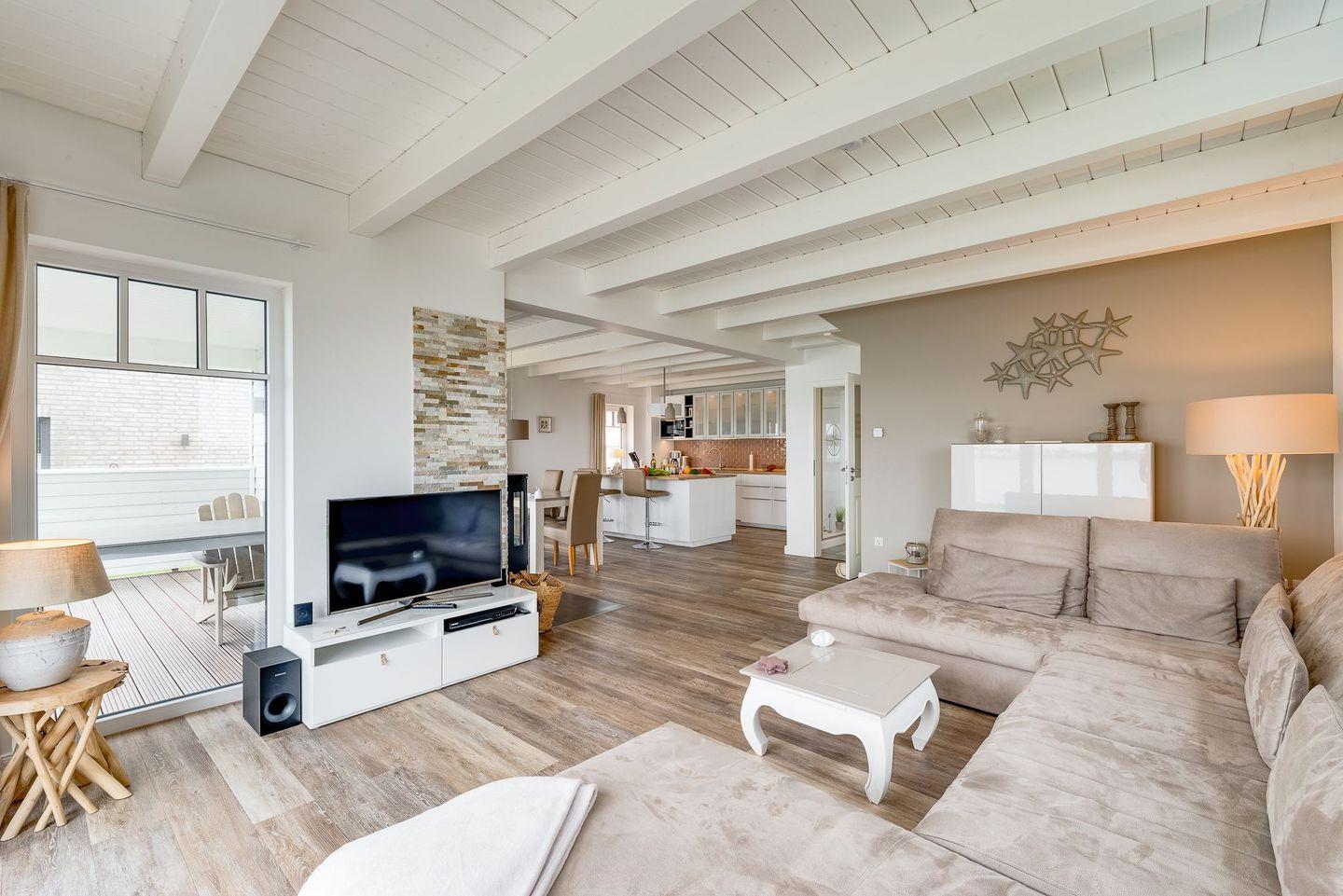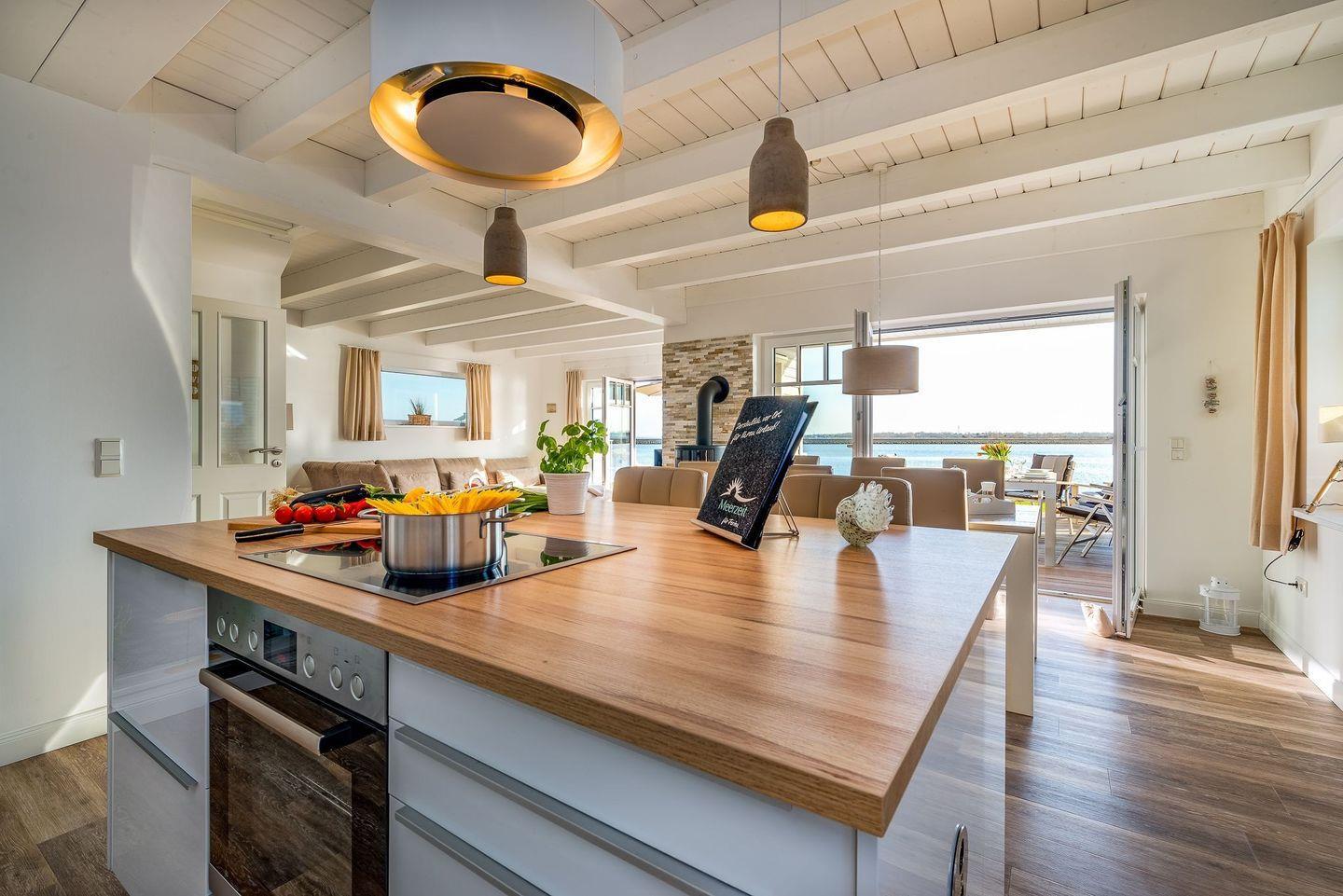 Der großzügige Wohnraum im Erdgeschoss hat über 50 qm und lädt mit großem U-förmigen Lounge-Sofa, integrierter, vollausgestatteter Küche und einem Kaminofen im Wohn-/Essbereich zum gemütlichen Beisammensein ein. Auch beim Kochen an der Kochinsel oder beim Essen, die Aussicht aufs Meer ist immer ein Genuss.