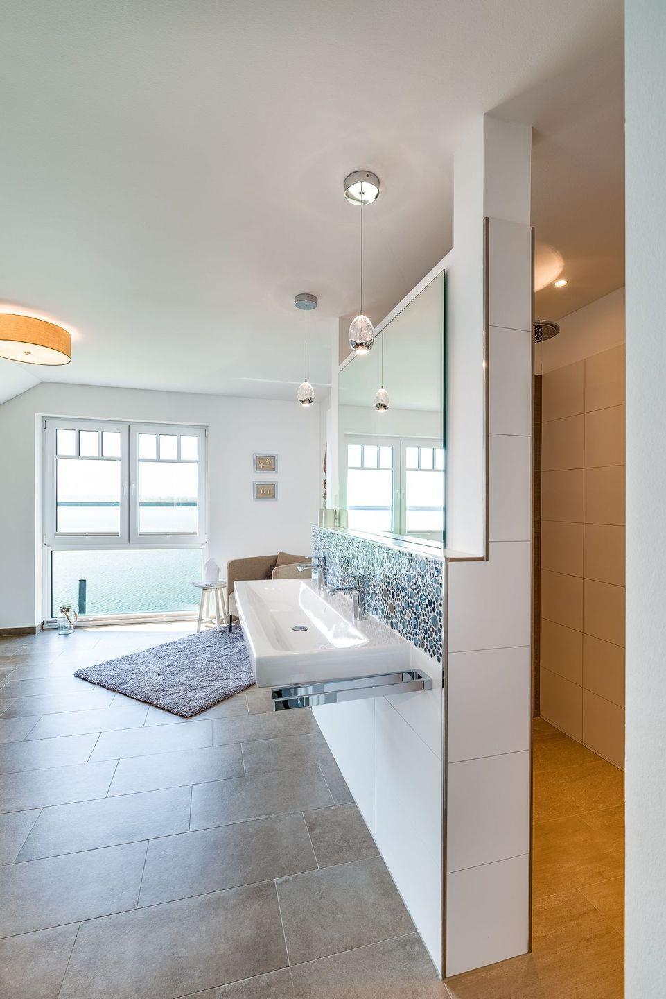 Ein modernes Badezimmer sowie ein Hauswirtschaftsraum mit Waschmaschine, Wäschetrockner und Spüle komplettieren das Erdgeschoss.