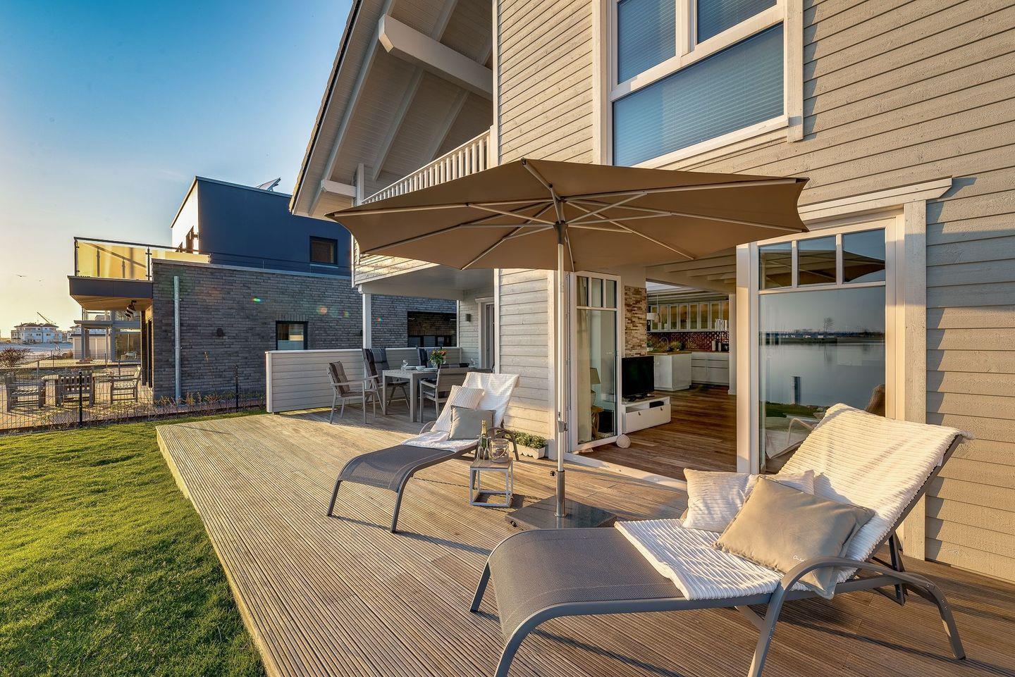 Bodentiefe Terrassenfenster auf der gesamten Südseite des Hauses ermöglichen einen wunderbaren Blick auf Hafen und Ostsee sowie den direkten Zugang zur großen Sonnenterrasse, die Dank der beiden Windschutzwände ganzjährig genutzt werden kann.