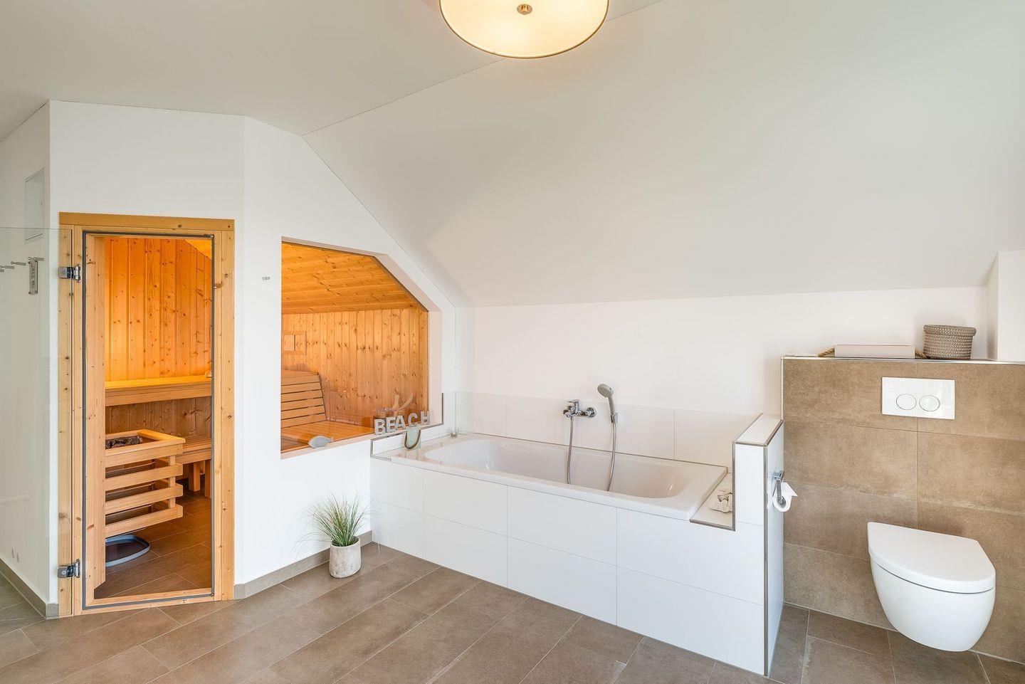 Das geräumige Wellnessbad verfügt über eine Regendusche, Badewanne und finnische Sauna sowie einen Zugang zum Balkon. Perfekt für einen erholsamen Urlaub zu jeder Jahreszeit. Sowohl aus der Sauna, als auch aus der Badewanne hat man freien Blick aufs Meer.