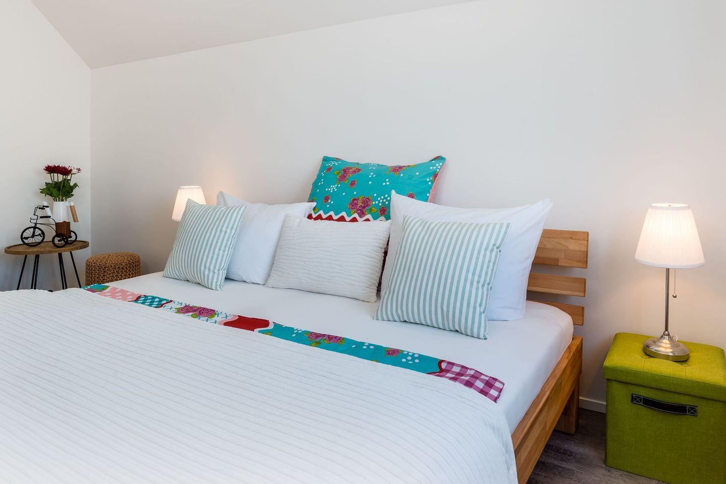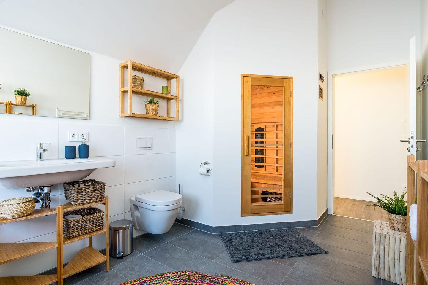 Über eine Treppe aus dem Wohnbereich gelangen Sie in das geräumige Obergeschoss. Hier befindet sich das große Badezimmer mit Wellnesssauna, Whirlwanne und Blick auf das Wasser. Ein großes Schlafzimmer mit Doppelbett und Blick auf die Marina laden zum Träumen und entspannen ein. Außerdem steht ein weiteres Schlafzimmer mit zwei Einzelbetten (80x200cm) zur Verfügung, die bei Bedarf zu zwei Doppelbetten ausgezogen werden können.