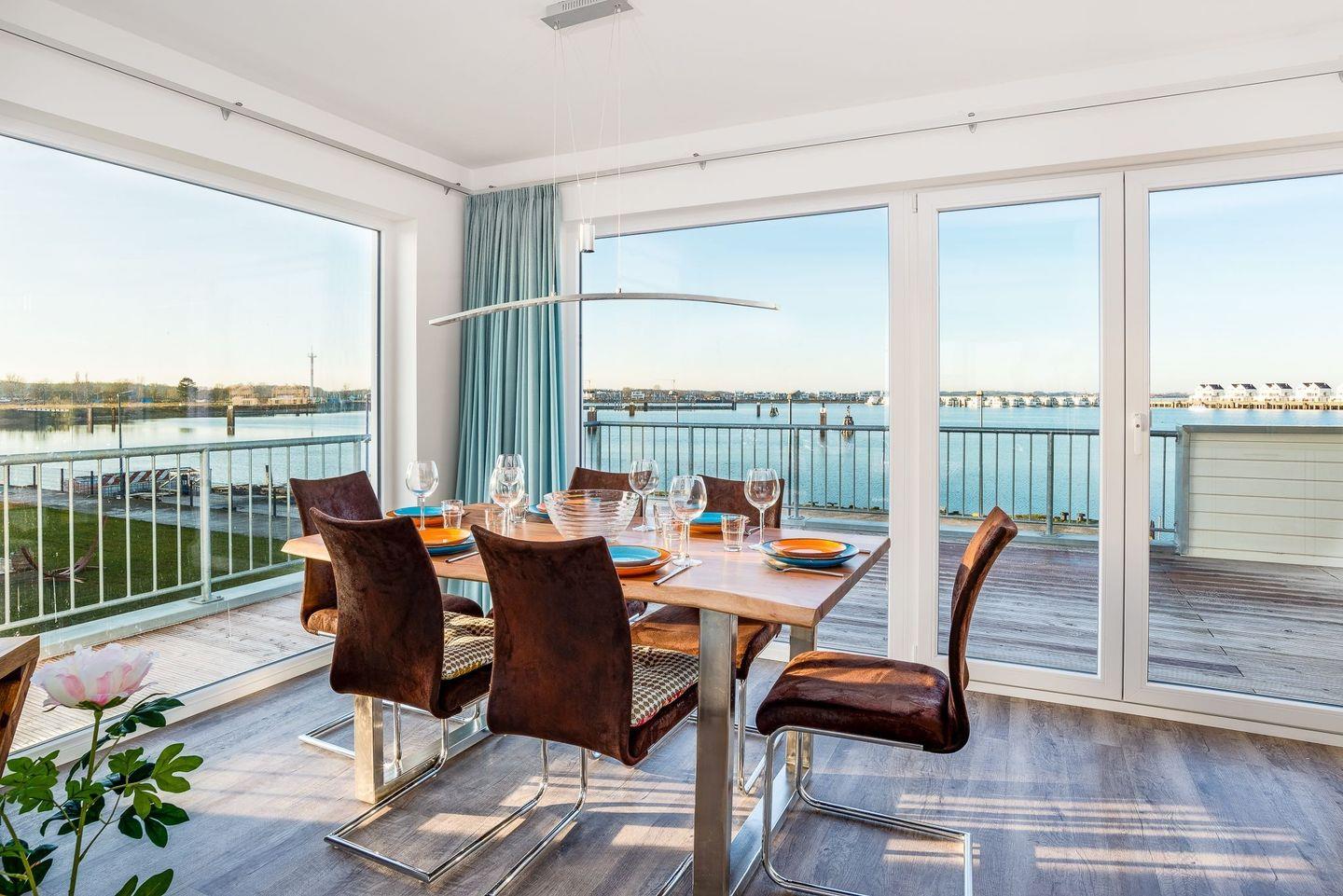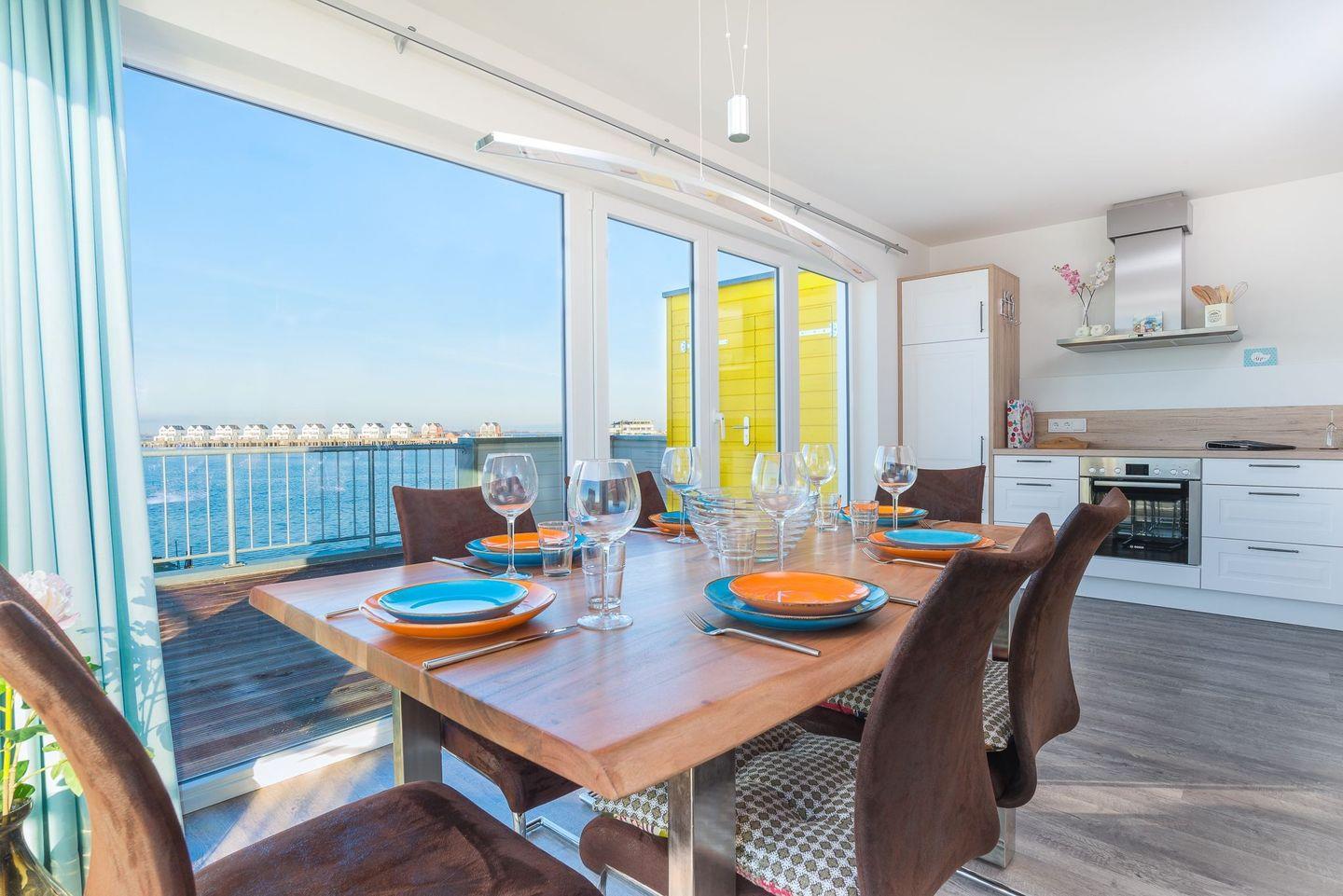 Hier erwartet Sie eine voll ausgestattete Küche mit gemütlichen Essbereich und Zugang zur großen Terrasse. Die Küche verfügt über eine Ausstattung, die über das übliche Maß hinaus geht. Die bodentiefen Fenster geben allen Räumen viel natürliches Licht und bieten einen fantastischen Blick auf die Ostsee und die Marina des OstseeResorts Olpenitz.