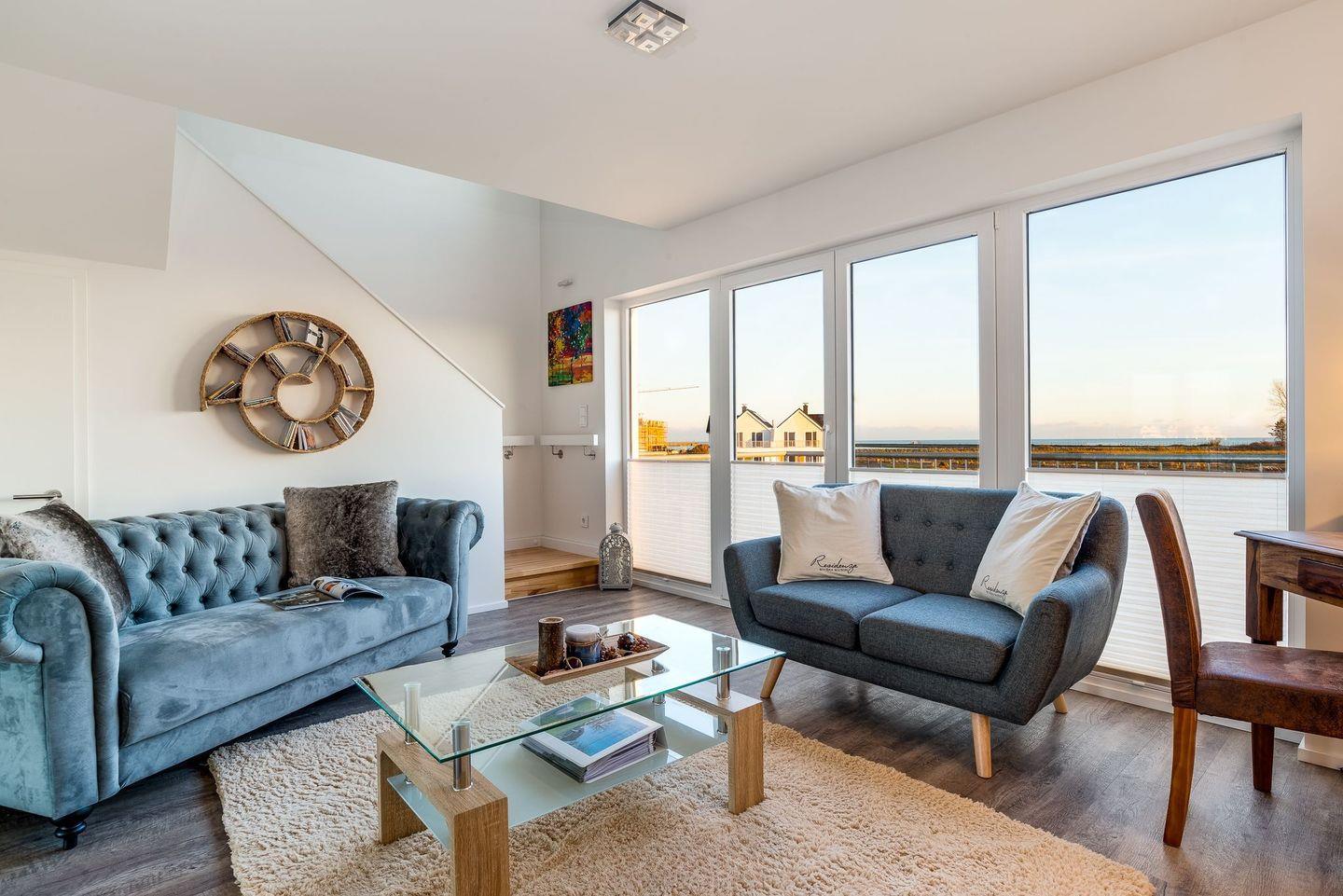 Die Ferienwohnung "Riviéra Maison" liegt direkt am Meer und bietet neben einer großen Terrasse, einen Balkon, eine Wellnesssauna, eine Whirlwanne und Kaminofen. Diese Luxusausstattung wird ergänzt durch 2 E-Bikes und einen Thermomix.