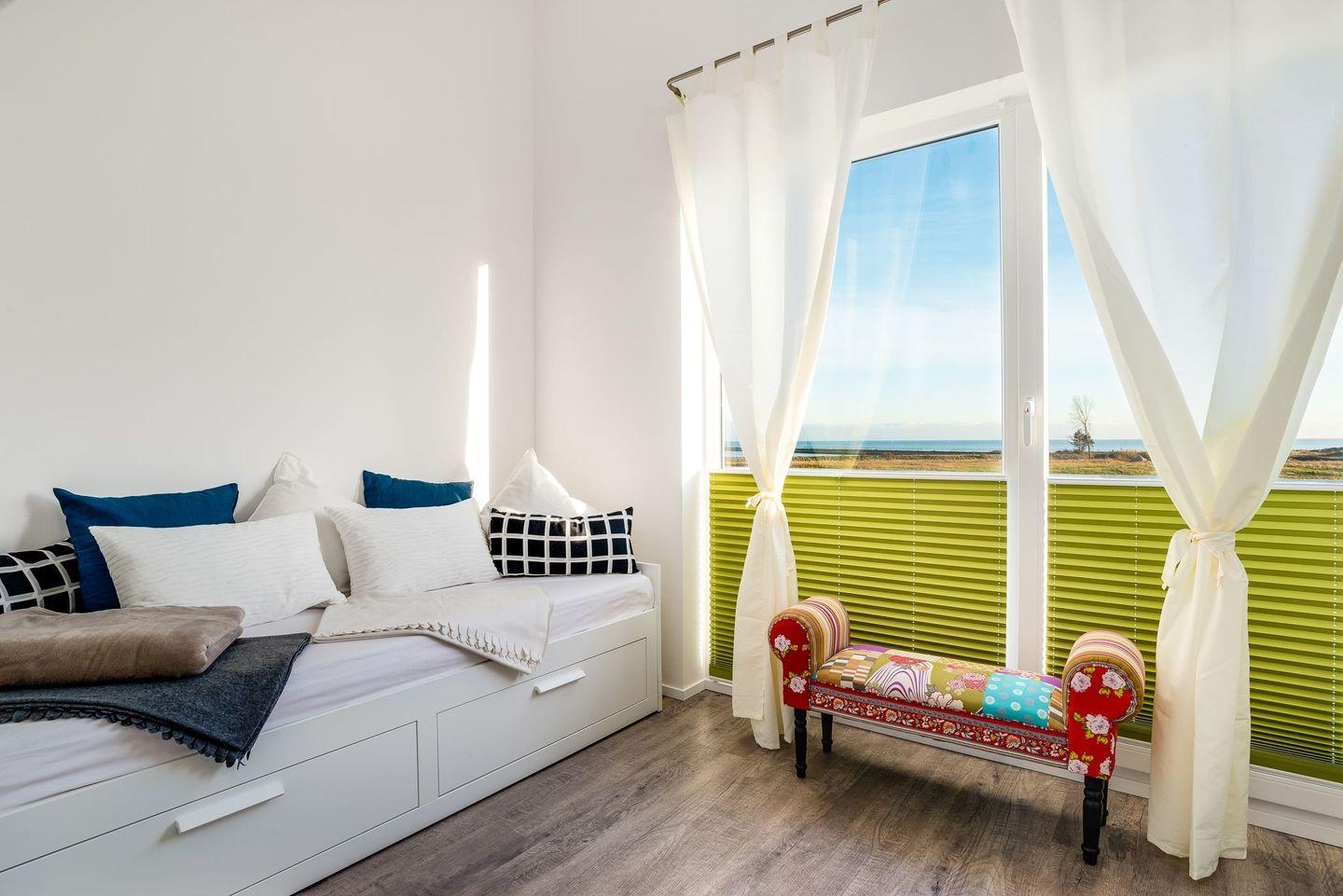 Der gemütliche Wohnbereich ist neben einem Kaminofen mit einem großen Flatscreen, einer Musikanlage, DVD-Player und einem Schreibtisch ausgestattet. Spiele, X-Box, DVDs und Bücher stehen unseren Gästen zur Verfügung. Auch in diesem Stockwerk gibt es ein Duschbad und der Balkon zur Süd-Ost-Seite mit Ostseeblick ist direkt aus Wohnbereich über Flügentüren erreichbar.