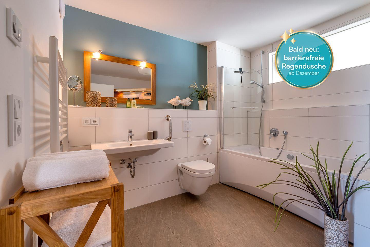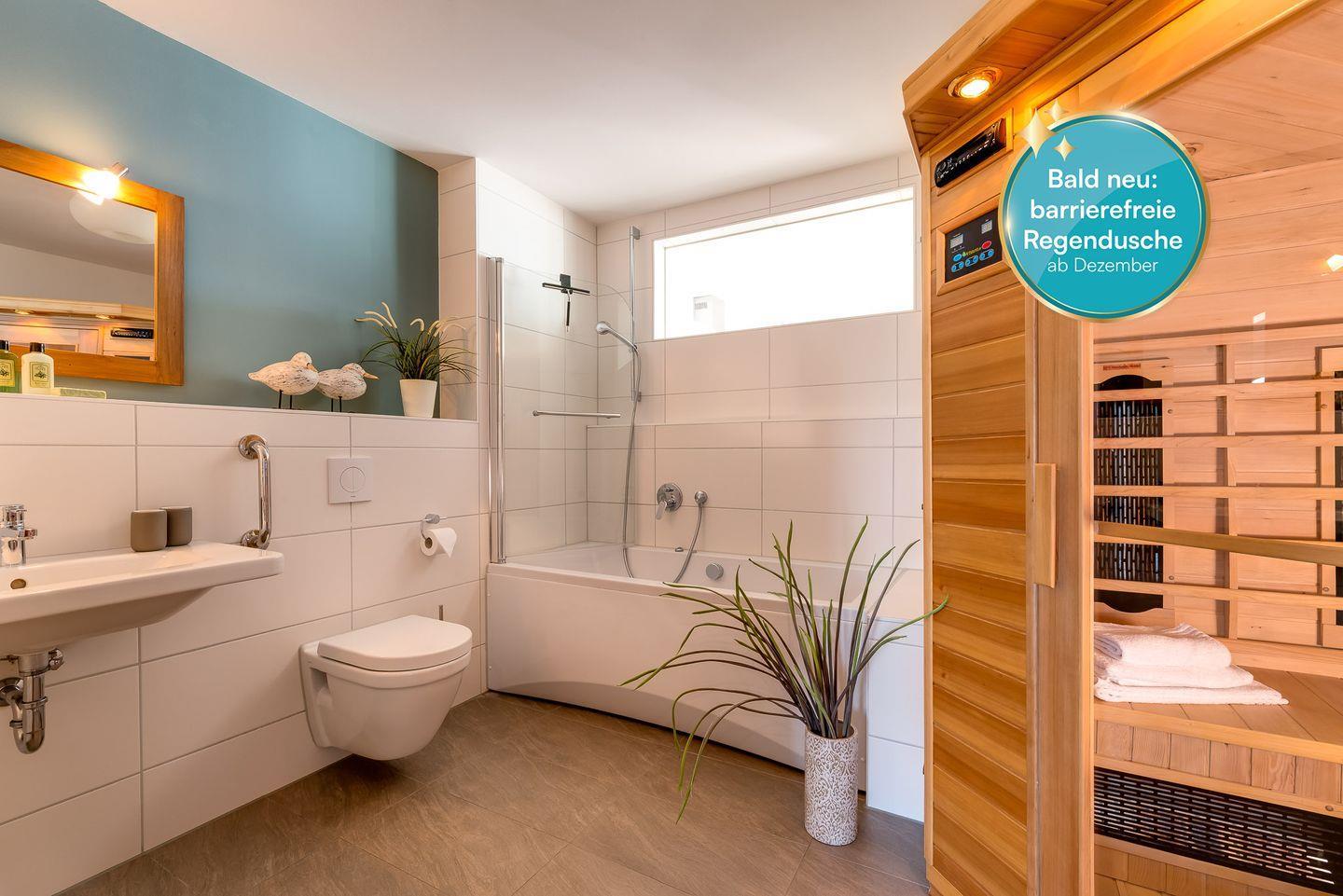 Im großen Wellnessbad mit Infrarotsauna und Stimmungslicht, einer großen barrierefreien Regendusche, WC und Waschtisch fängt der Tag besonders schön an. Bei Schietwetter kann auch hier herrlich entspannt und relaxed werden. Eine Waschmaschine ist ebenfalls vorhanden.