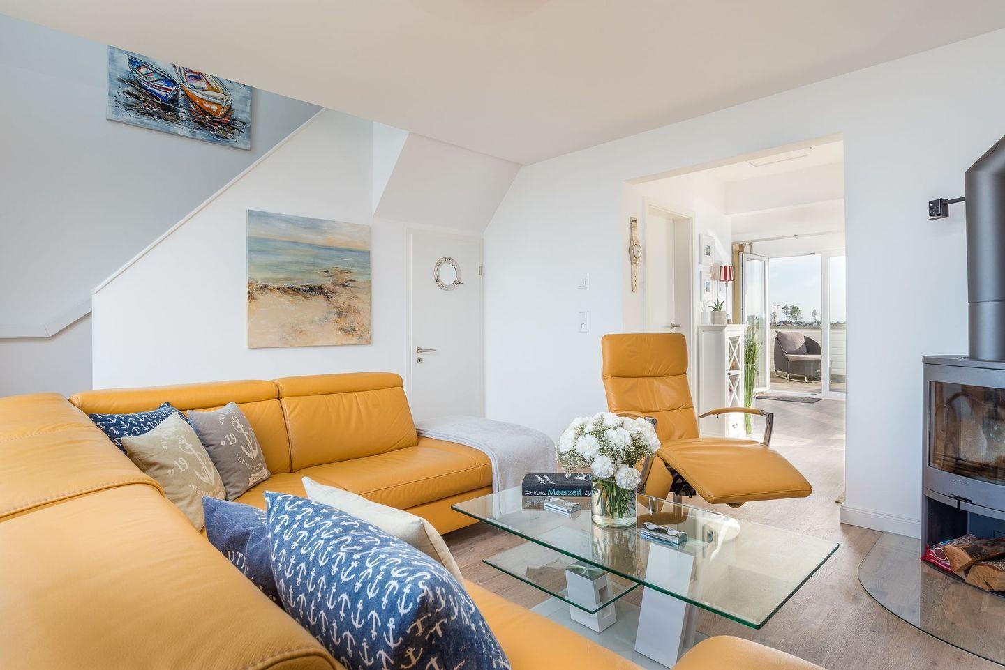 Angrenzend an den Küchenbereich finden Sie ein Gäste-WC mit Dusche. Das großzügige Wohnzimmer mit Kamin verspricht Behaglichkeit. Der Kamin knistert an kühlen Tagen und sorgt für eine wohlige Atmosphäre. Der Blick schweift über die Schlei, Sie beobachten Schiffe.