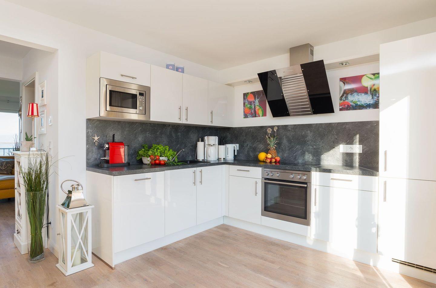 Der Küchen- und Essbereich im Obergeschoss öffnet sich zu einer ca. 25 m² großen Terrasse. Hier erwartet Sie ein 180-Grad-Panoramablick auf den gesamten Hafen und die glitzernde Ostsee. Ein Strandkorb lädt zum Verweilen ein. Die Sonne scheint, eine leichte Brise weht – hier atmen Sie Ostseeflair.