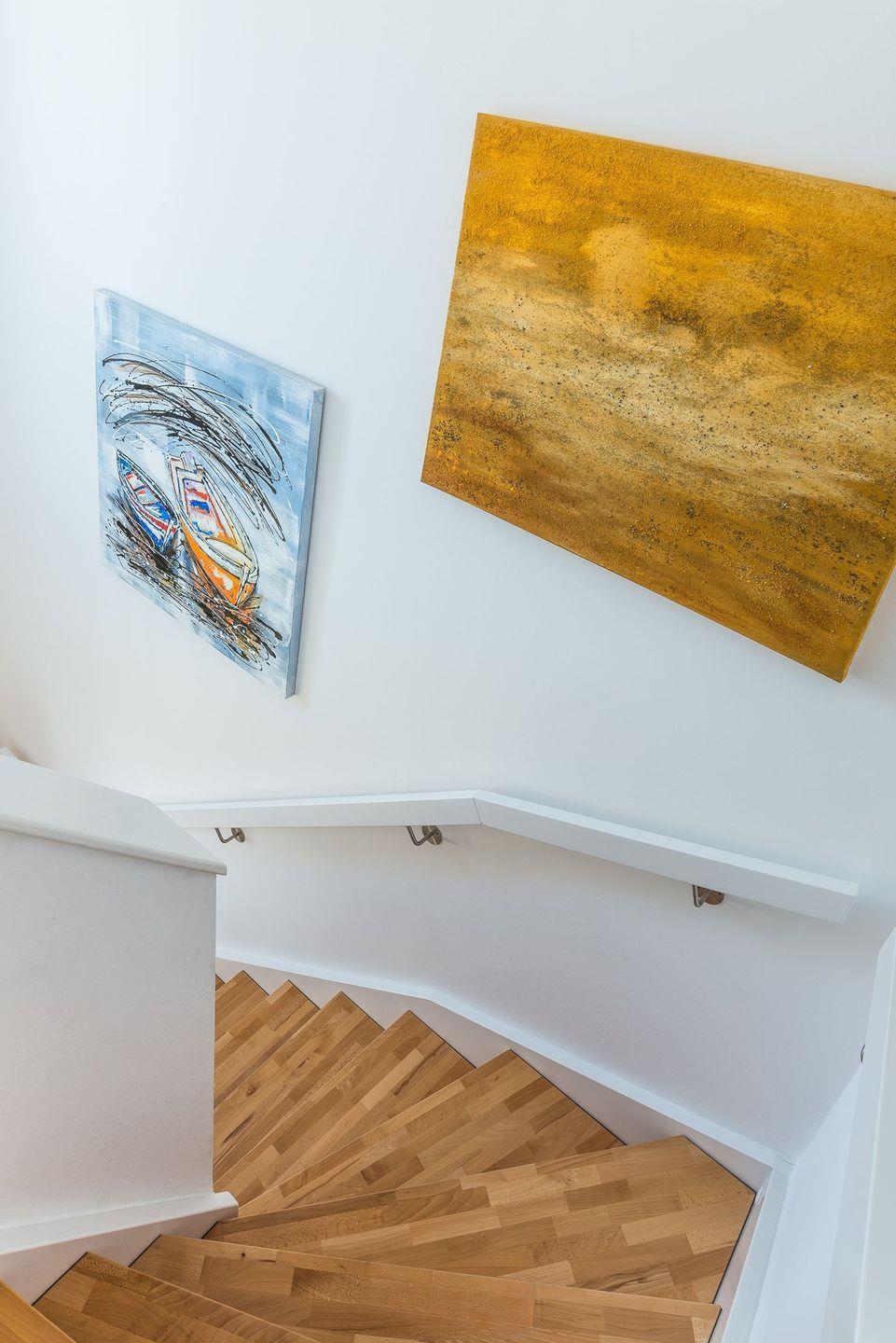 Vom Wohnzimmer führt eine bequeme Treppe führt nach oben zum Dachgeschoss.