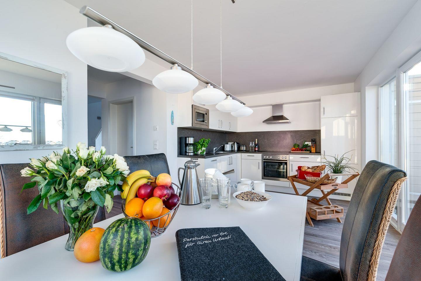 Im 1. OG befindet sich das großzügige lichtdurchflutete Wohnzimmer mit Blick auf die Schlei. Das Wohnzimmer verfügt über einen Kamin und ein bequemes großes Schlafsofa. Die voll ausgestattete Küche, mit integriertem großzügigen Essbereich, erfreut auch Hobbyköche. Dem gemütlichen Beisammensein steht auch beim Kochen nichts im Wege. Der große Esstisch mit 6 bequemen Stühlen lädt zum gemeinsamen Essen und geselligen Spieleabenden ein. - Außerdem befindet sich im OG der großzügige Eingangsbereich mit Garderobe und ein voll ausgestattetes Bad mit Dusche, Waschbecken und WC.