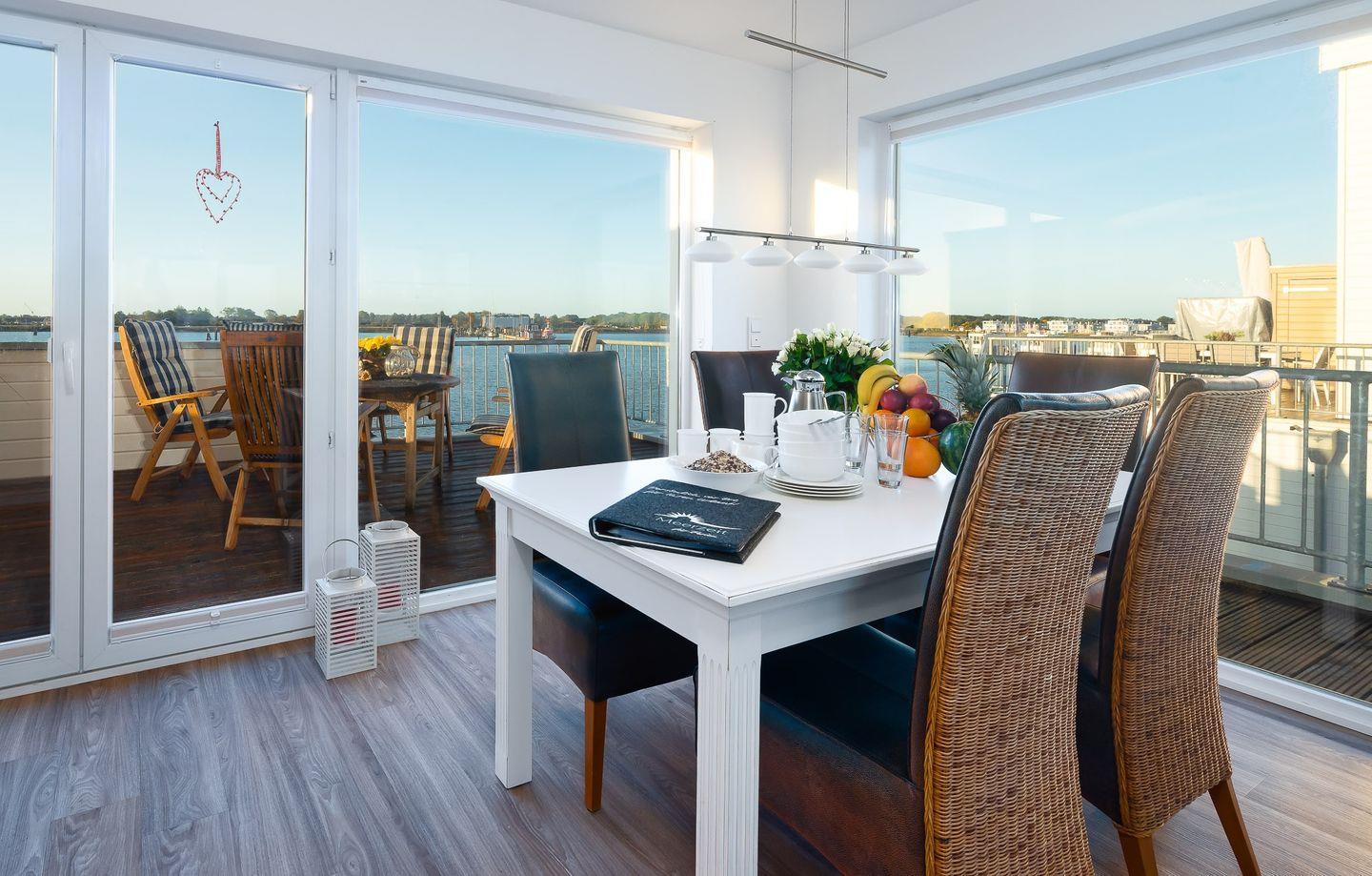 Vom Wohnbereich aus gelangt man auf die 25 qm große Sonnenterrasse mit Südausrichtung. Die Terrasse ist mit hochwertigen Teakholzmöbeln für 6 Personen, Sonnenschirm und Elektro-Grill ausgestattet. Der Blick über den Hafen und auf die Ostsee lädt zum Entspannen und Genießen ein.