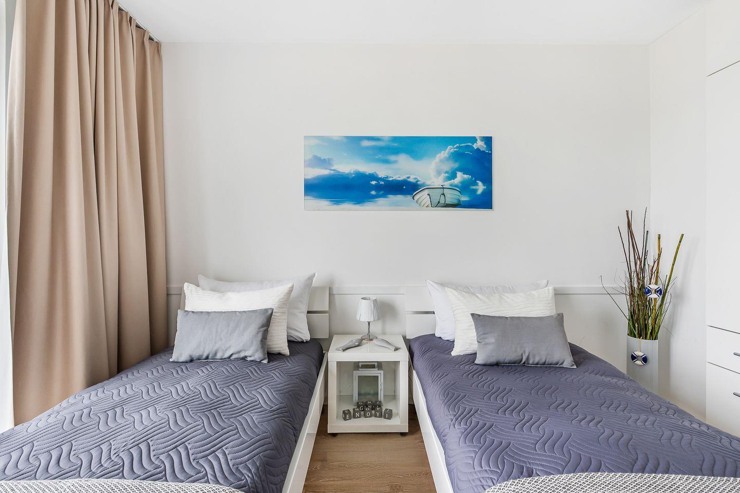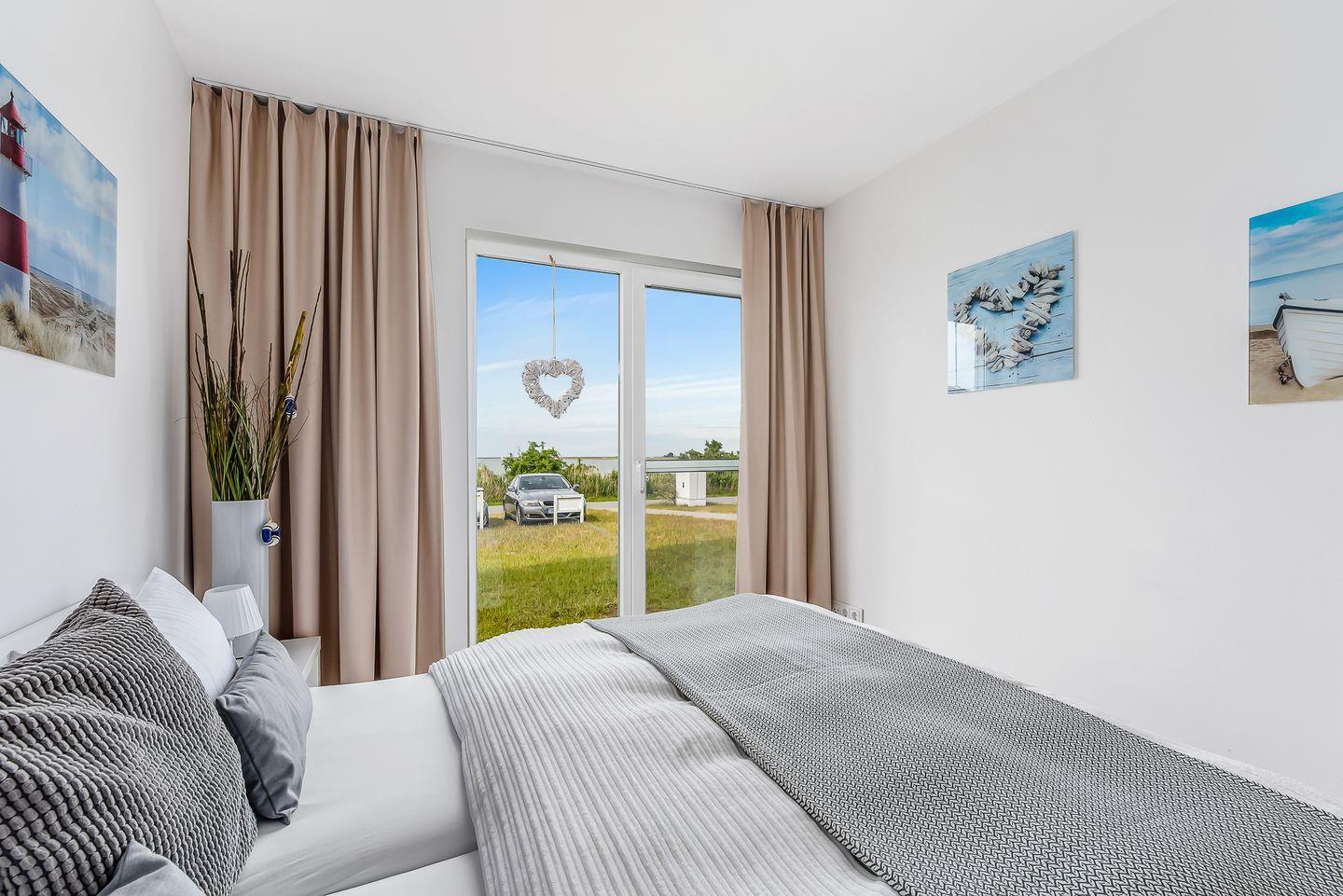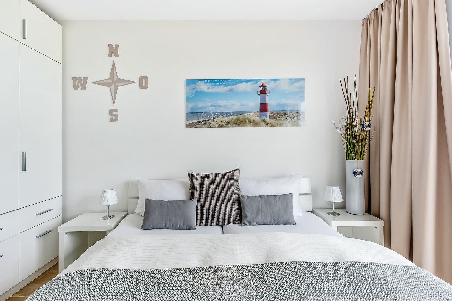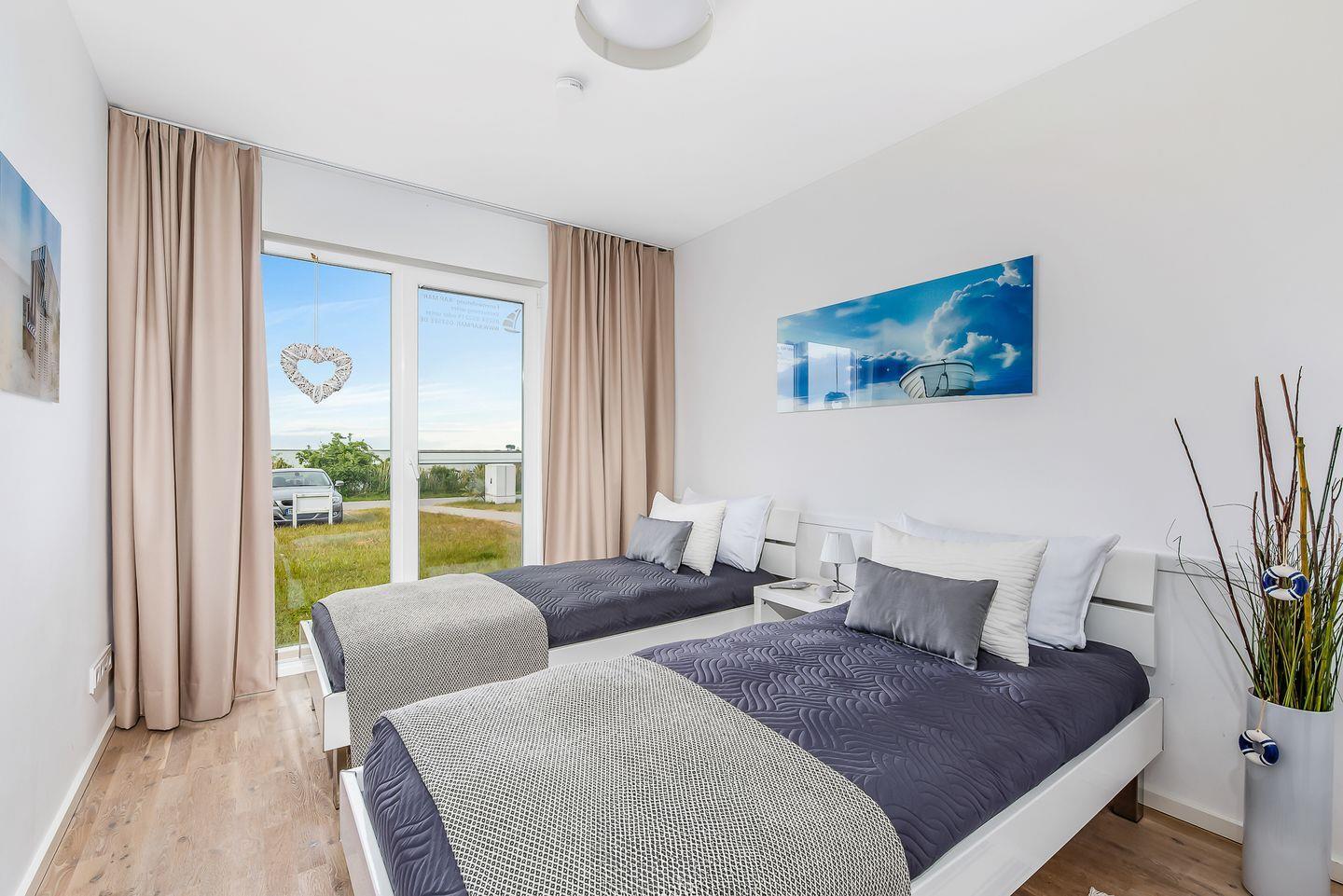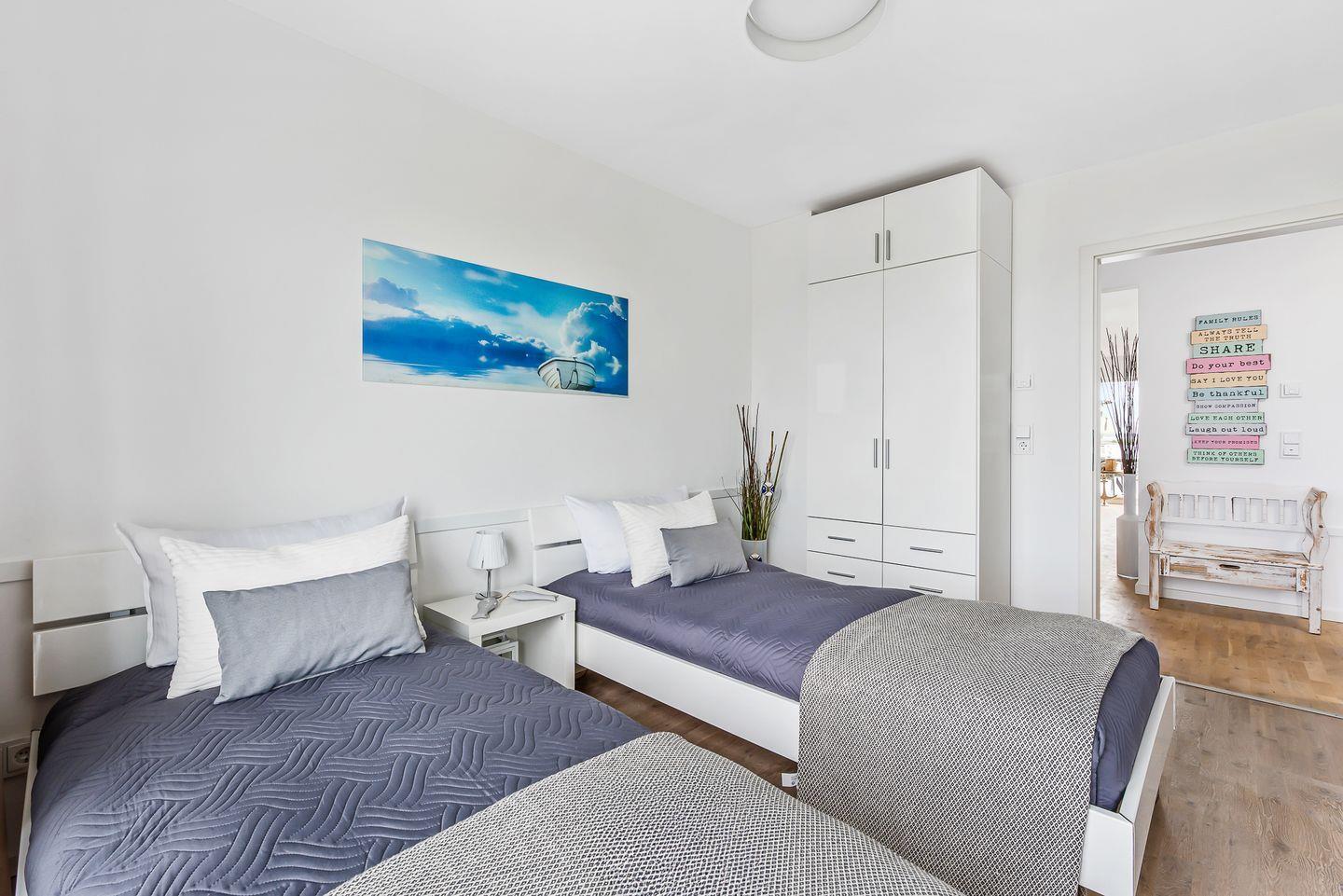 Für eine erholsame Nachtruhe und Entspannung vom Alltag sorgen die rückenschonenden Matratzen in beiden Schlafzimmern. Die Zimmer sind Richtung Norden ausgerichtet und bieten einen traumhaften Blick auf die Schlei und die vorbeiziehenden Segelschiffe, ausgestattet mit einem Doppelbett 180 x 200 bzw. 2 Einzelbetten 90 x 200, die bei Bedarf zusammengestellt werden können. Das exklusive Badezimmer ist neben den üblichen Utensilien zusätzlich mit einer Whirlpoolwanne und einer Infrarotsauna ausgestattet. Föhn und Vergrößerungsspiegel sind ebenfalls vorhanden.