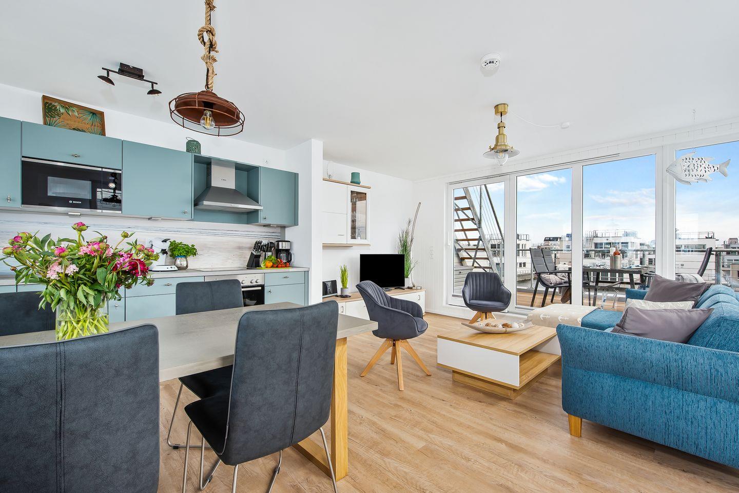 Das schwimmende Ferienhaus "5 Beaufort" verfügt über 2 Etagen, wobei sich der große Wohn-/Essbereich mit integrierter Küche im Obergeschoss befindet. Die großen Panoramafenster ermöglichen einen wunderbaren Blick auf das Hafenkino und über eine große Schiebetür gelangt man auf die große Terrasse. Das Obergeschoss mit seinem gemütlichen Schlafsofa, dem Esstisch und der gut ausgestatteten Küche lädt zu gemütliche Stunden mit Freunden und der Familie ein.