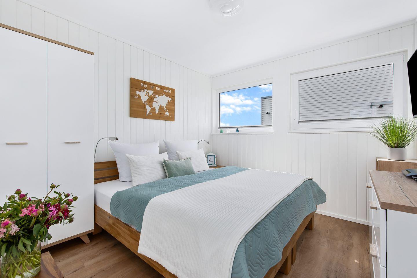 Im Erdgeschoss befinden sich zwei Schlafzimmer. Das große Schlafzimmer verfügt über bodentiefe Panoramafenster und ist mit einer großen Schiebetür ausgestattet. Auf dieser Terrasse finden unsere Gäste bequeme Sitzmöglichkeiten vor, um den ersten Kaffee am Morgen auf dem Wasser zu geniessen. Von hier aus ist der direkte Zugang zur unteren, um das komplette Haus verlaufenden Terrasse, möglich. Das zweite Schlafzimmer bietet ebenfalls Doppelbetten und ist mit einem TV ausgestattet.