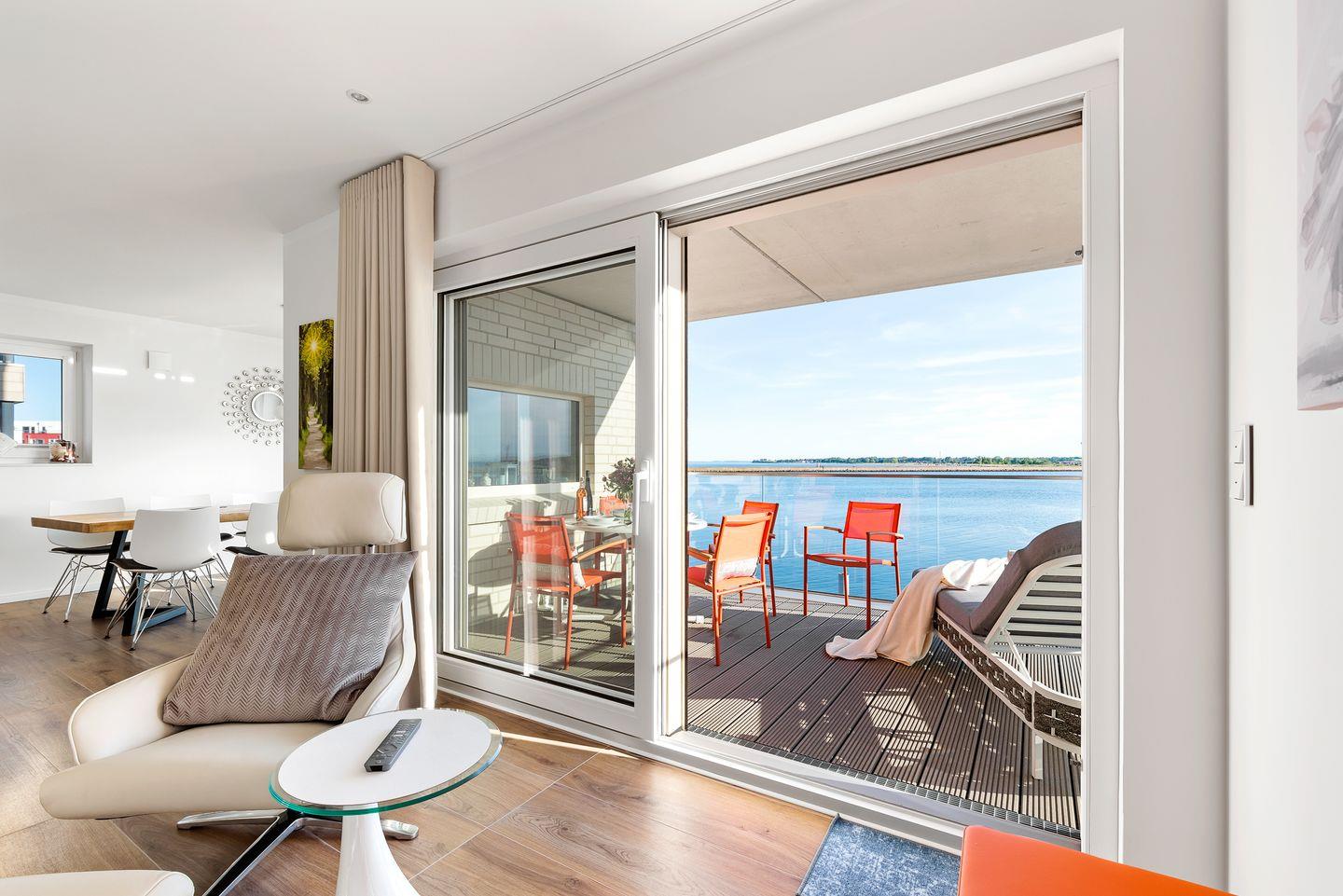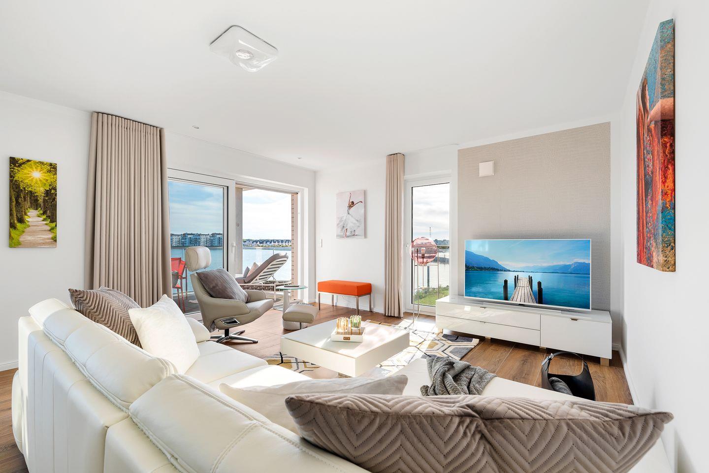 Das Apartment Horizont bietet auf ca. 113 qm genügend Platz für 5 Personen. Der große Wohn-Essbereich mit Südausrichtung, bodentiefen Fenstern und Blick auf die einlaufenden Segelyachten in die Marina Olpenitz bieten das perfekte Panorama, um einen erholsamen Urlaub zu genießen. Die bequeme Couch mit Schlaffunktion, der Smart-TV und der bequeme Lesesessel runden die stilvolle Einrichtung dieses besonderen Apartments ab.