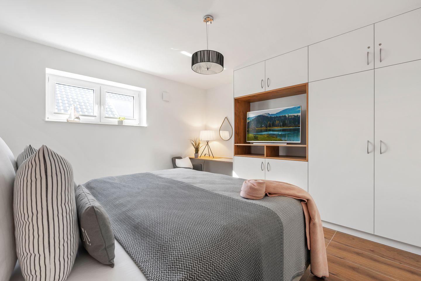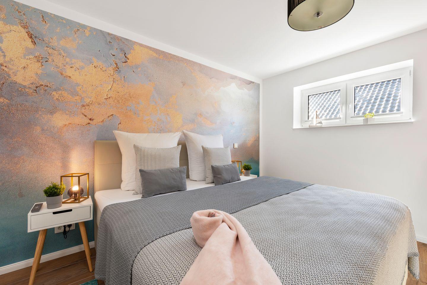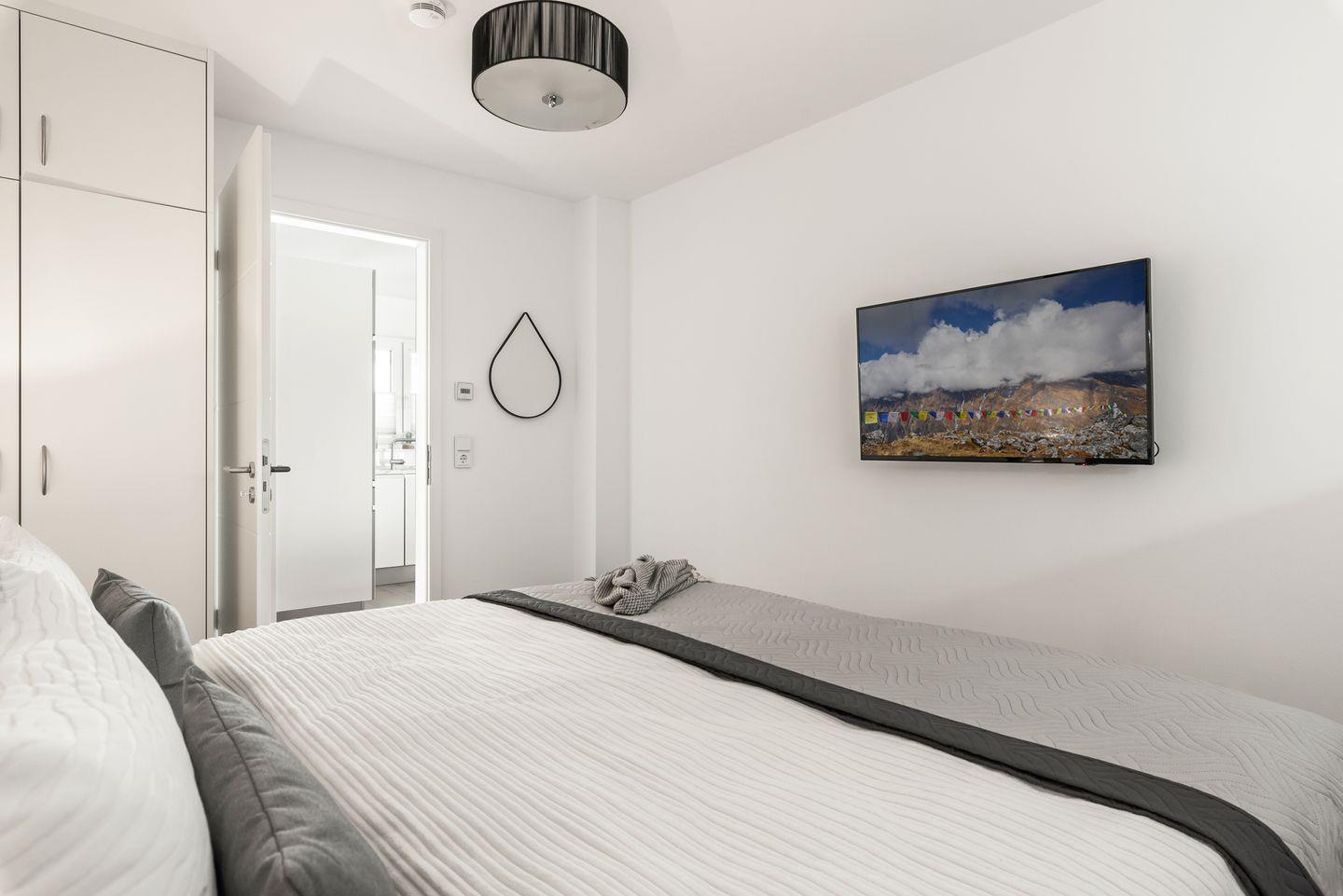 Zwei große Schlafzimmer mit integrierten Kleiderschränken, hochwertigen Boxspringbetten, Schreibtisch und Smart-TV bieten die perfekte Erholung in der Nacht. Das liebevoll eingerichtete Einzelzimmer ist mit Kinderspielzeug, einem Kleiderschrank und kindgerechten Bildern ausgestattet.